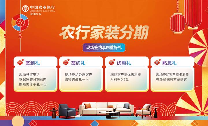 如果你刚好有家装采购需求,不妨先办理农行家装分期,杭州农行为本次家博会准备了的大礼包,除了上述“优惠礼”,还有三重大礼包: