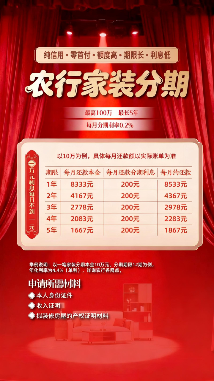 如果你还没有农行家装分期卡,只需带上身份证前往农行任意网点即可申请(收入证明及拟装修房屋的产权证明可以在手机上查询),材料齐全一般三个工作日即可出款。