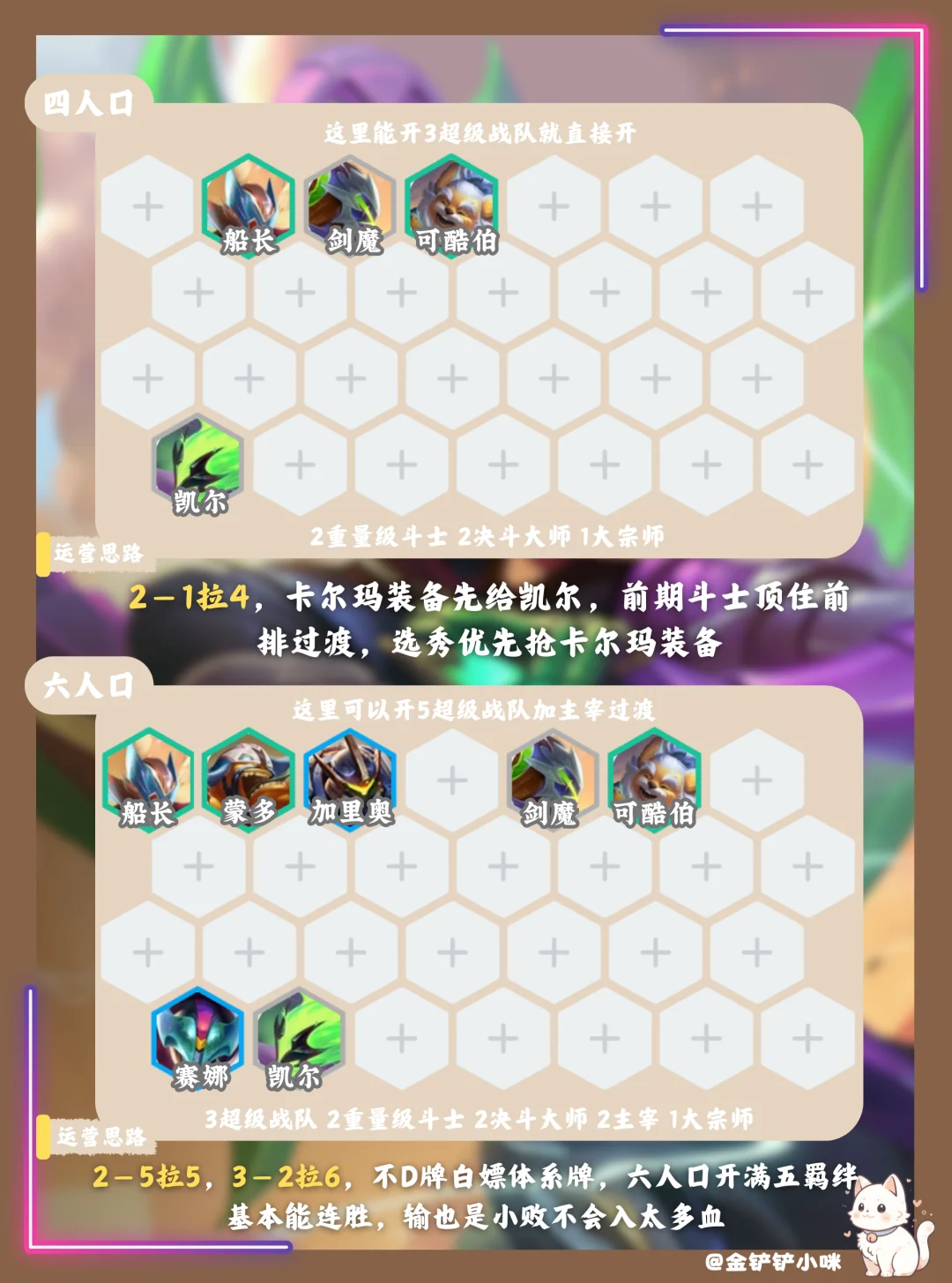 2️⃣阶段2-1拉4,2-5拉5,前期斗士过渡,凯尔带卡尔玛装备,选秀优先抢卡尔玛皇子装备