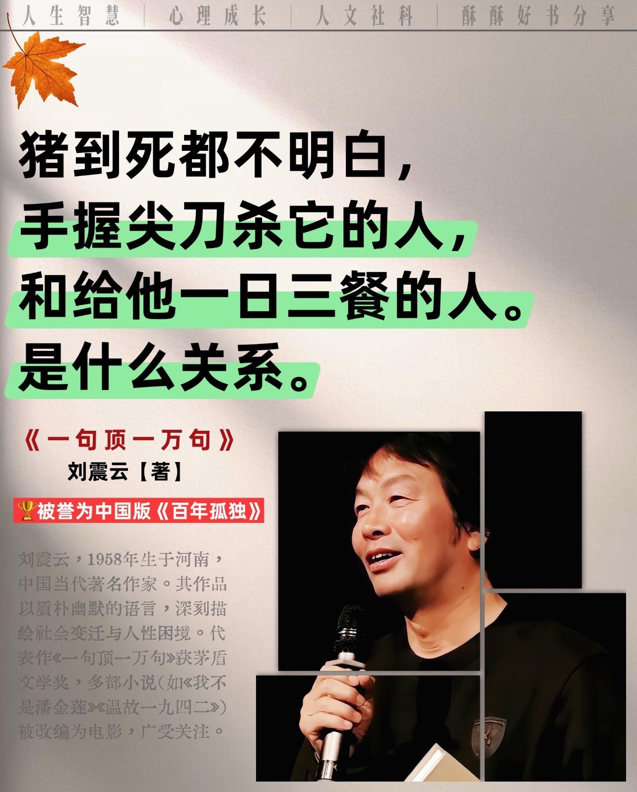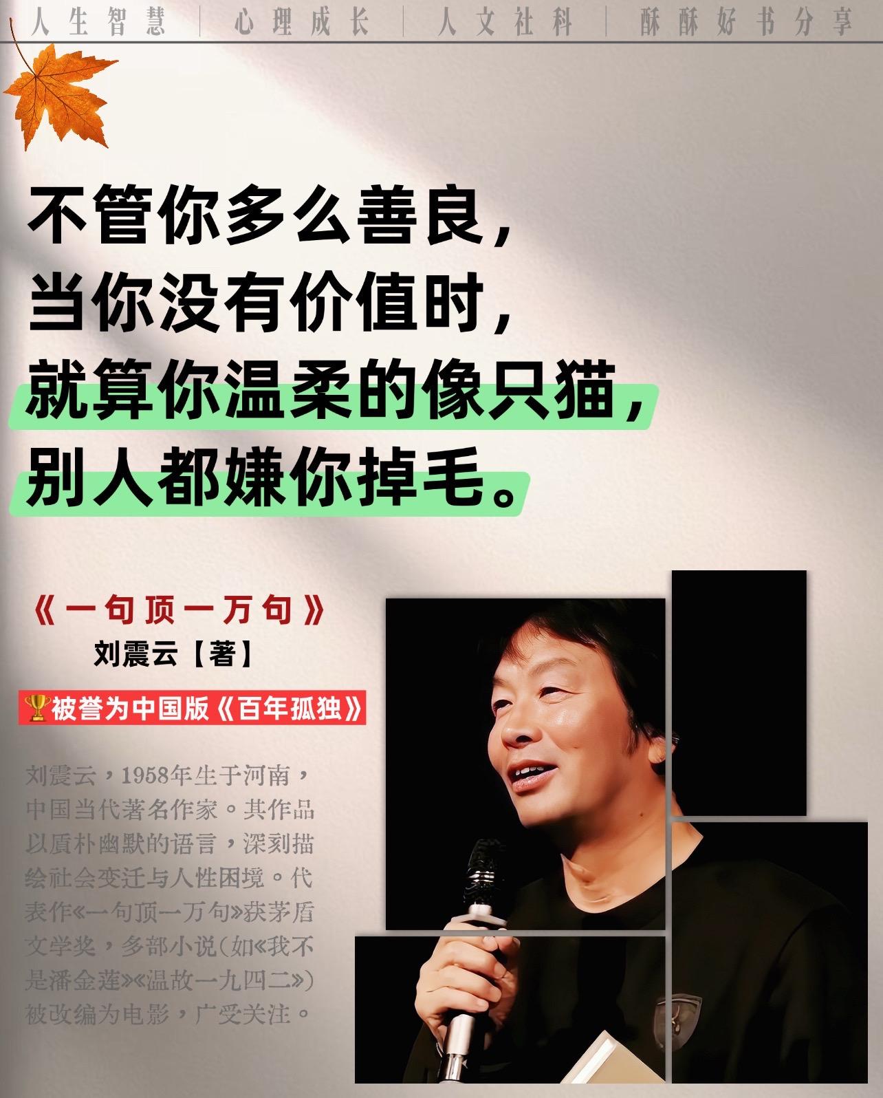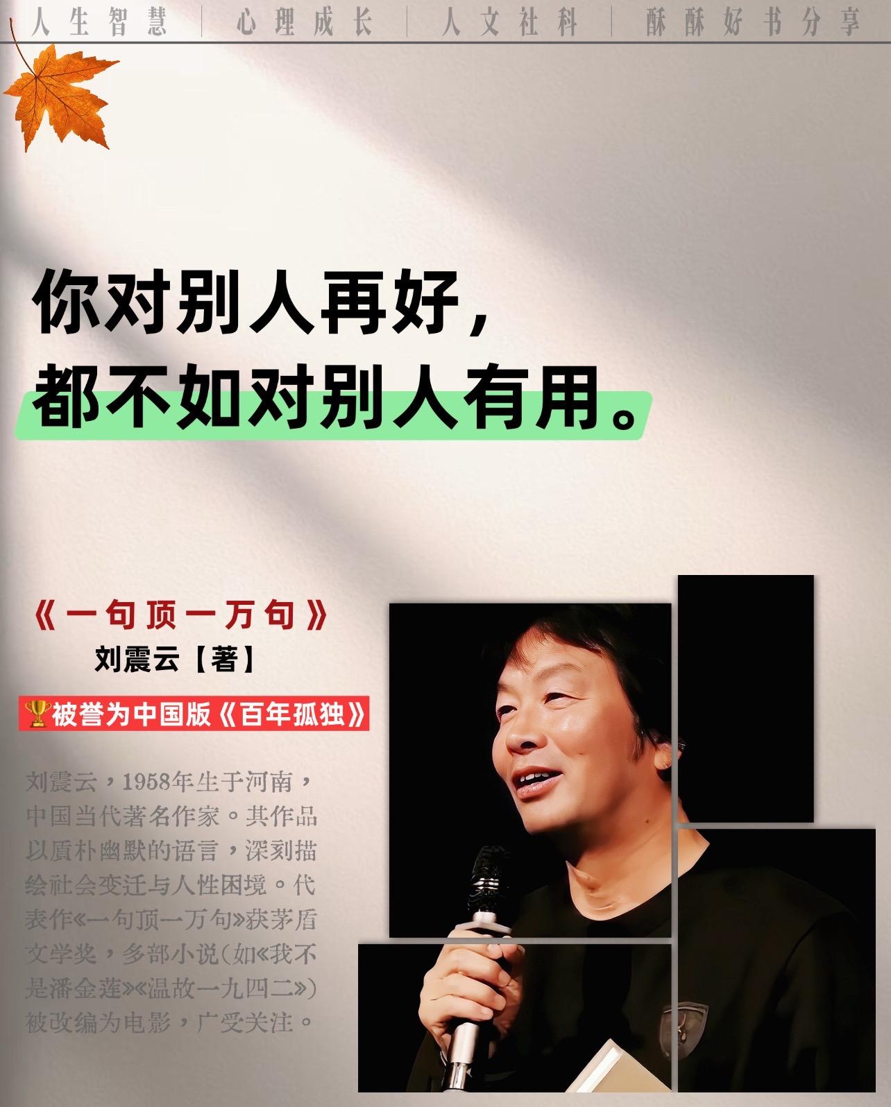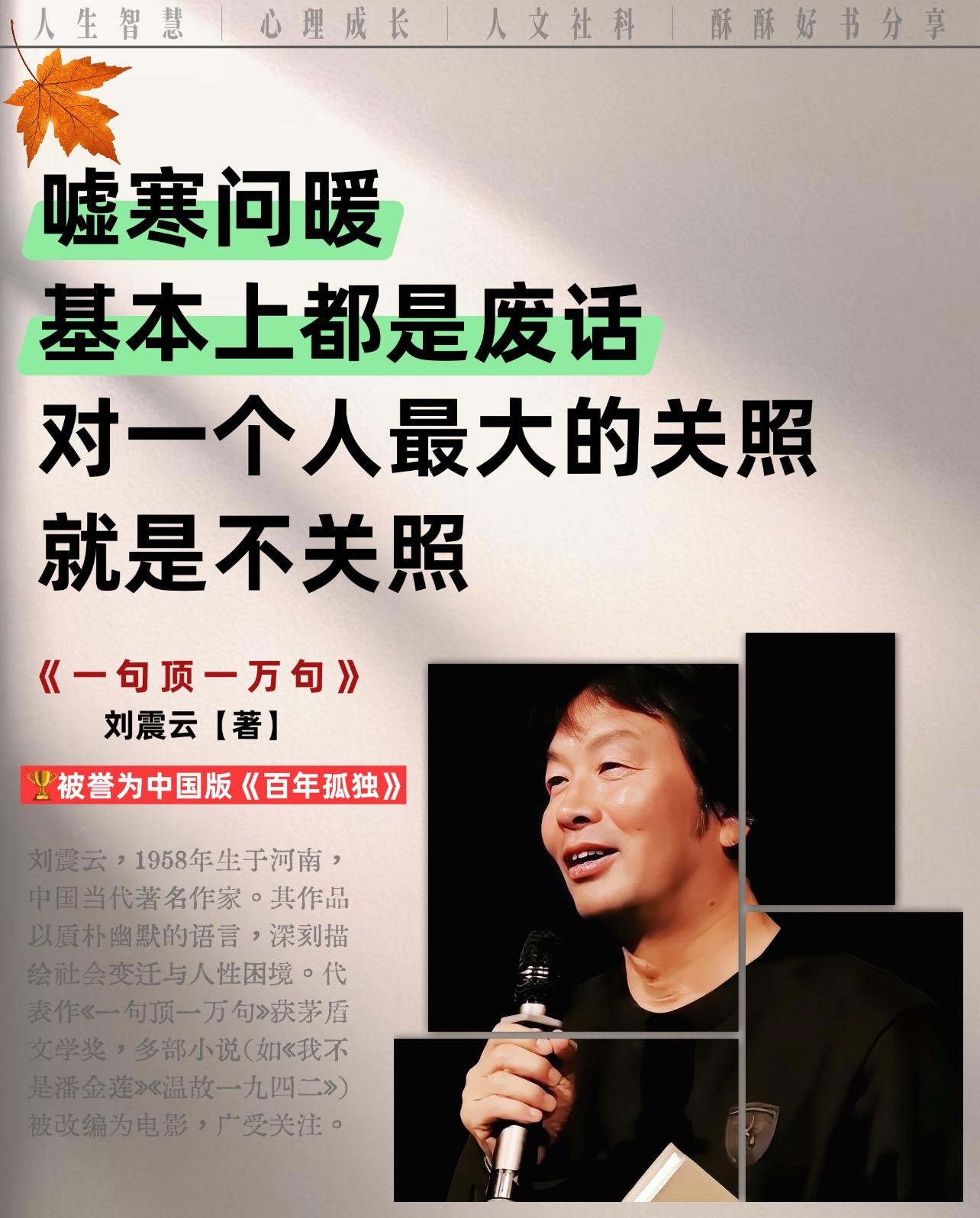 读懂《一句顶一万句》,才算懂成年人的孤独。刘震云封神神作《一句顶一万句》!读它像被温柔裹住,人性洞察通透到骨子里! 沉浸其中是场澄澈的精神抚慰,故事鲜活肌理下藏着言语力量与沟通困境的深邃哲思。冷峻笔触裹着悲悯,细腻处写尽灵魂孤独重量,字句如银针入穴,精准刺破人性幽微与生存无奈,读来灵魂激荡、共鸣如潮! 既是对言语之光的礼赞,更是对沟通壁垒的深沉省思,这本常读常新的生命之书,值得反复品读!