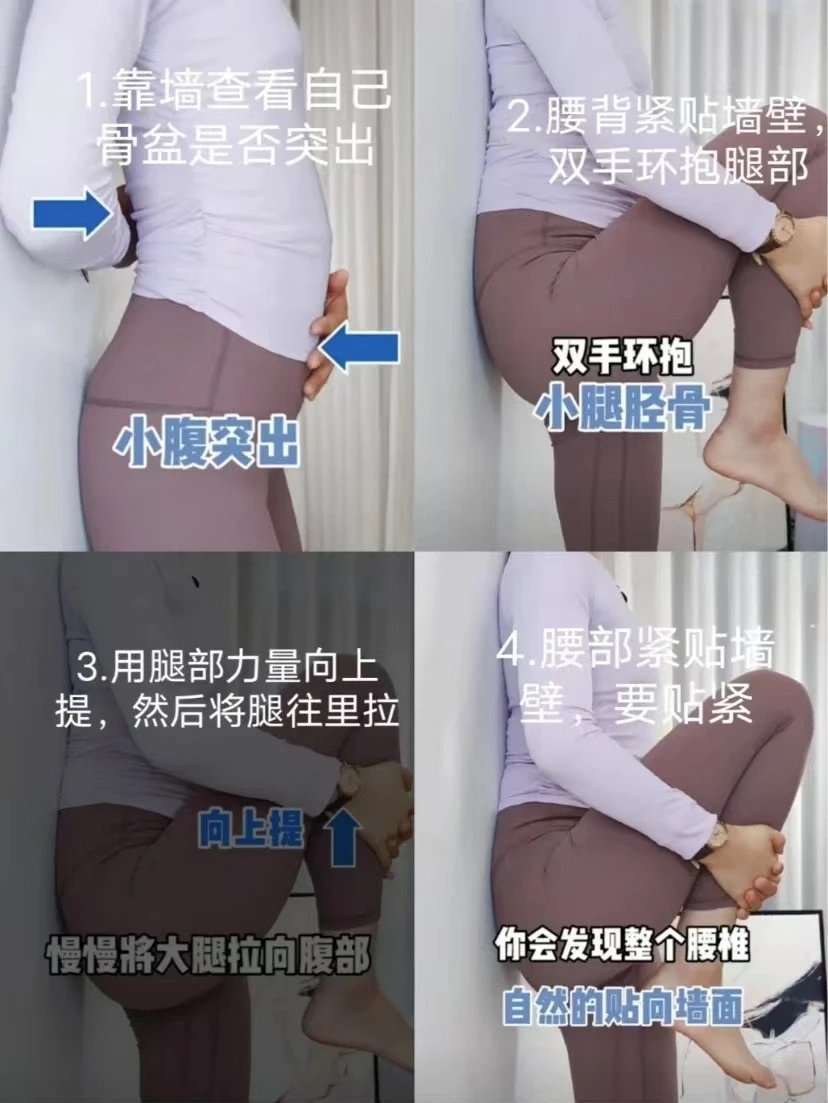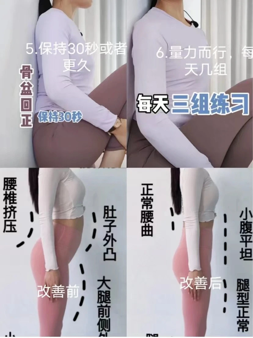 一骨盆前倾危害 1小腹突出,第一个问题是吃饱了明明很瘦但,但肚子却很大,第二个问题是很容易造成翘臀得假象,其实是骨盆前倾 2小腿外翻 3腰肌劳损 4.背陀 二出现这些我问题的原因在于长期久坐,不对站姿,走路姿势,饮食方面有关,都是长期养成的坏习惯 三其实每天只需要给个十分钟到二十分钟,上班族再忙,也要留些时间给自己,这些问题也可以得到好好得改善,只要有面墙就可以把小问题化为零,赶紧行动起来