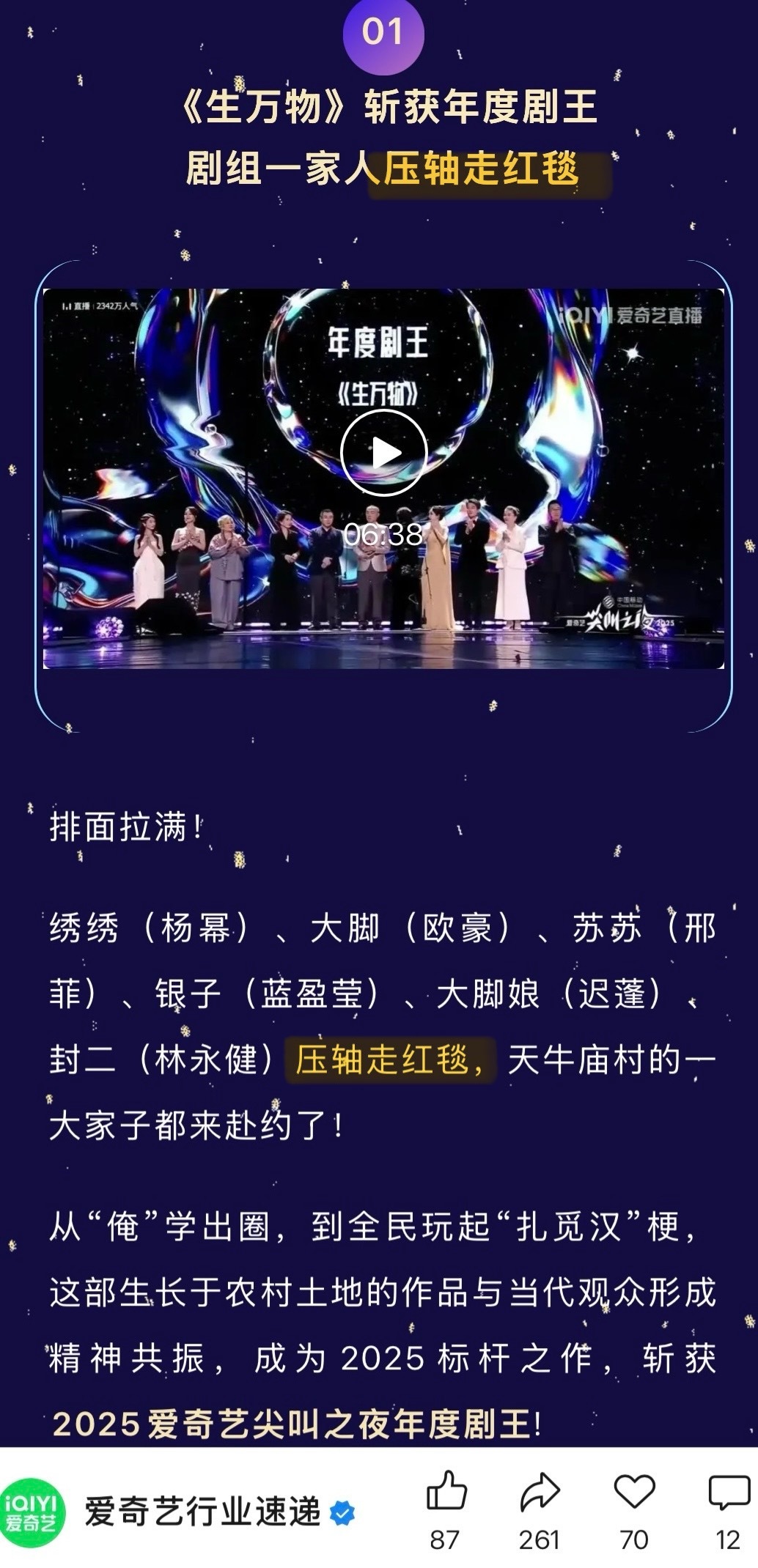 爱奇艺不仅又又又一次强调【杨幂登顶尖叫年度演员荣誉】还再一次强调生万物【压轴走红毯】红毯压轴+登顶 只有杨幂👏