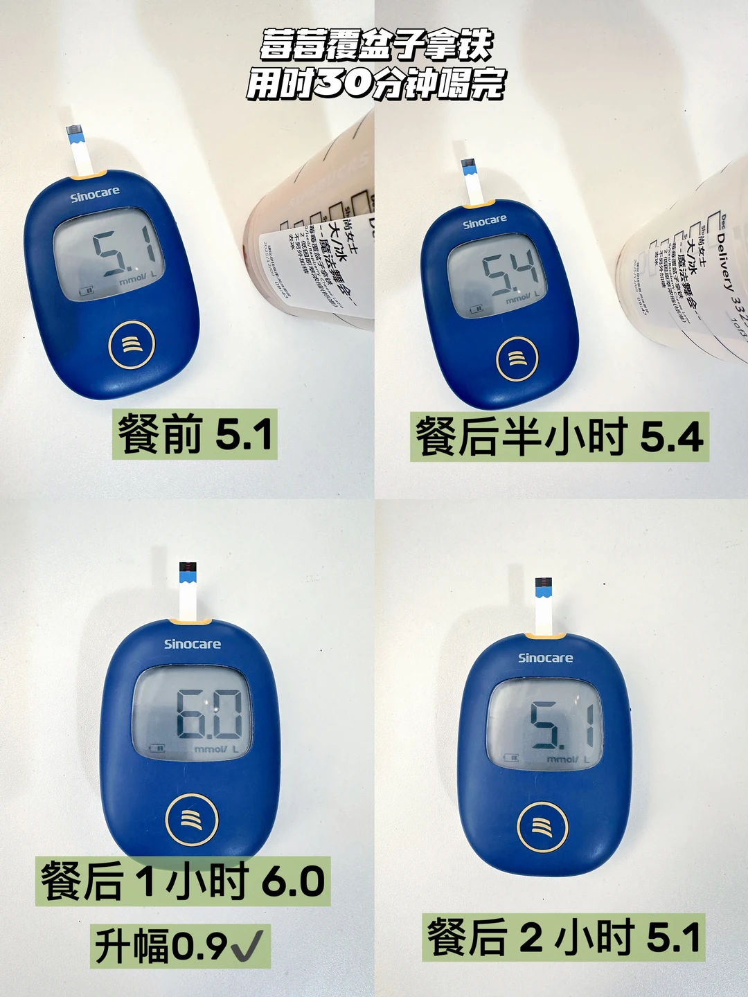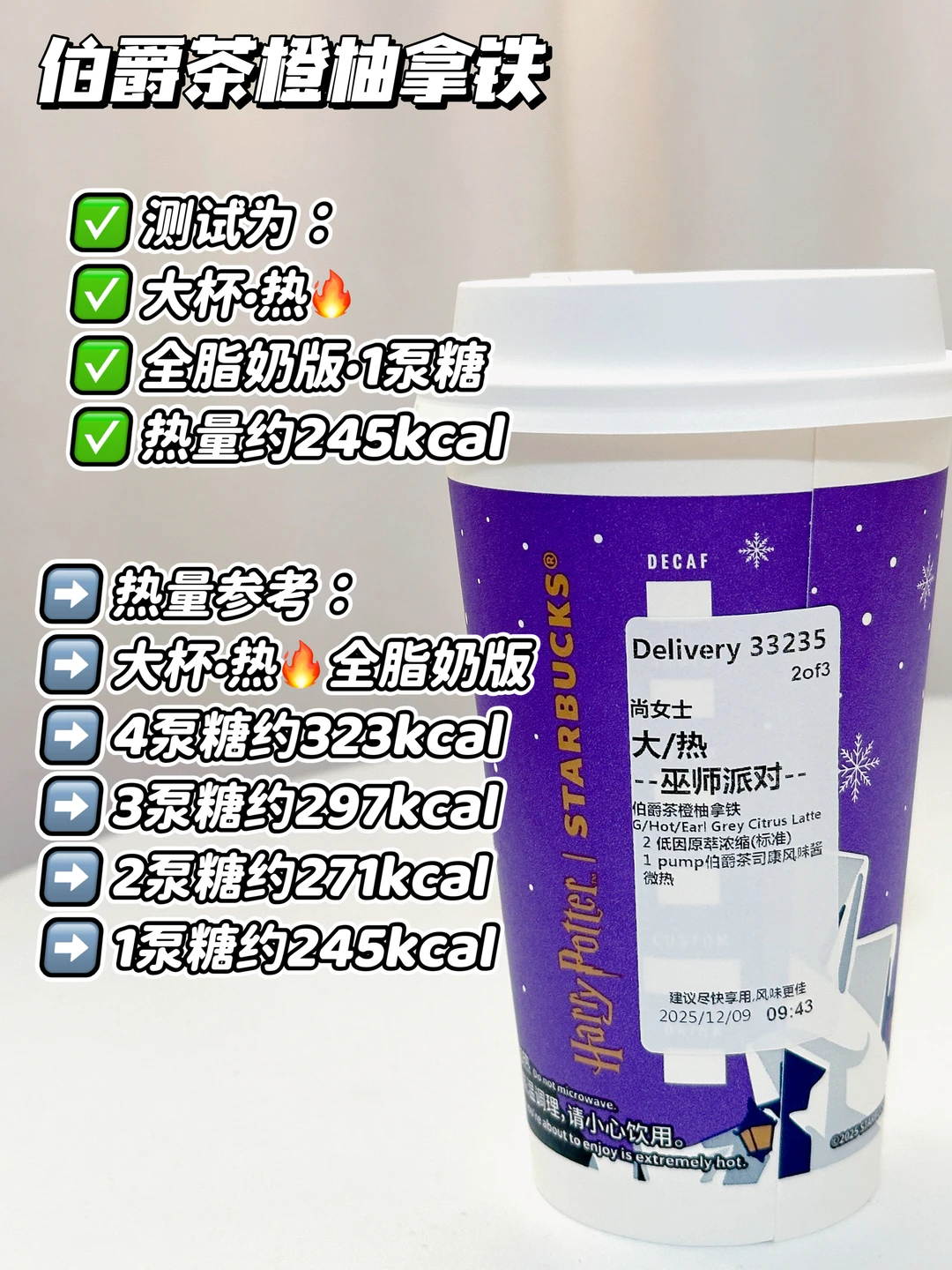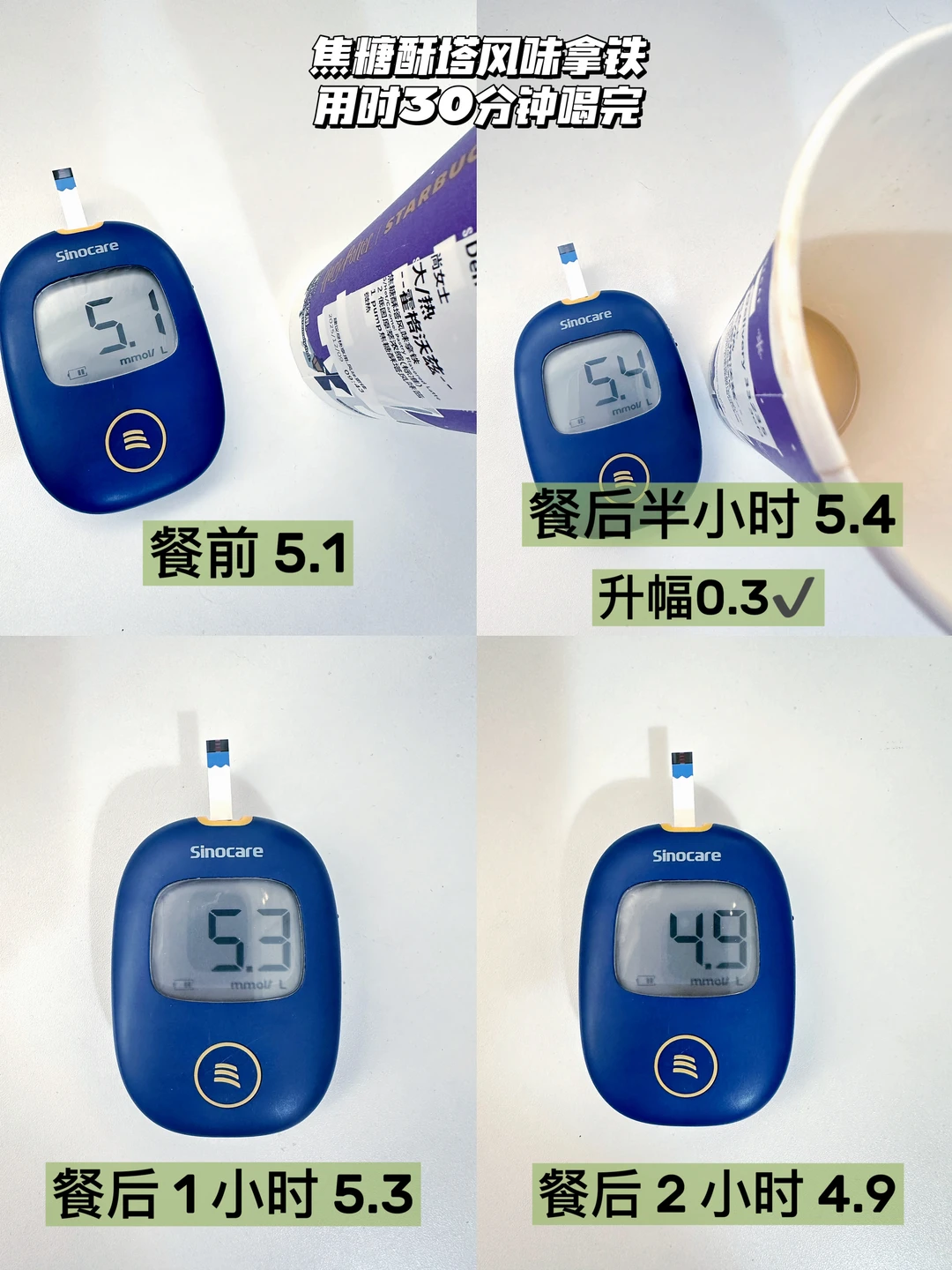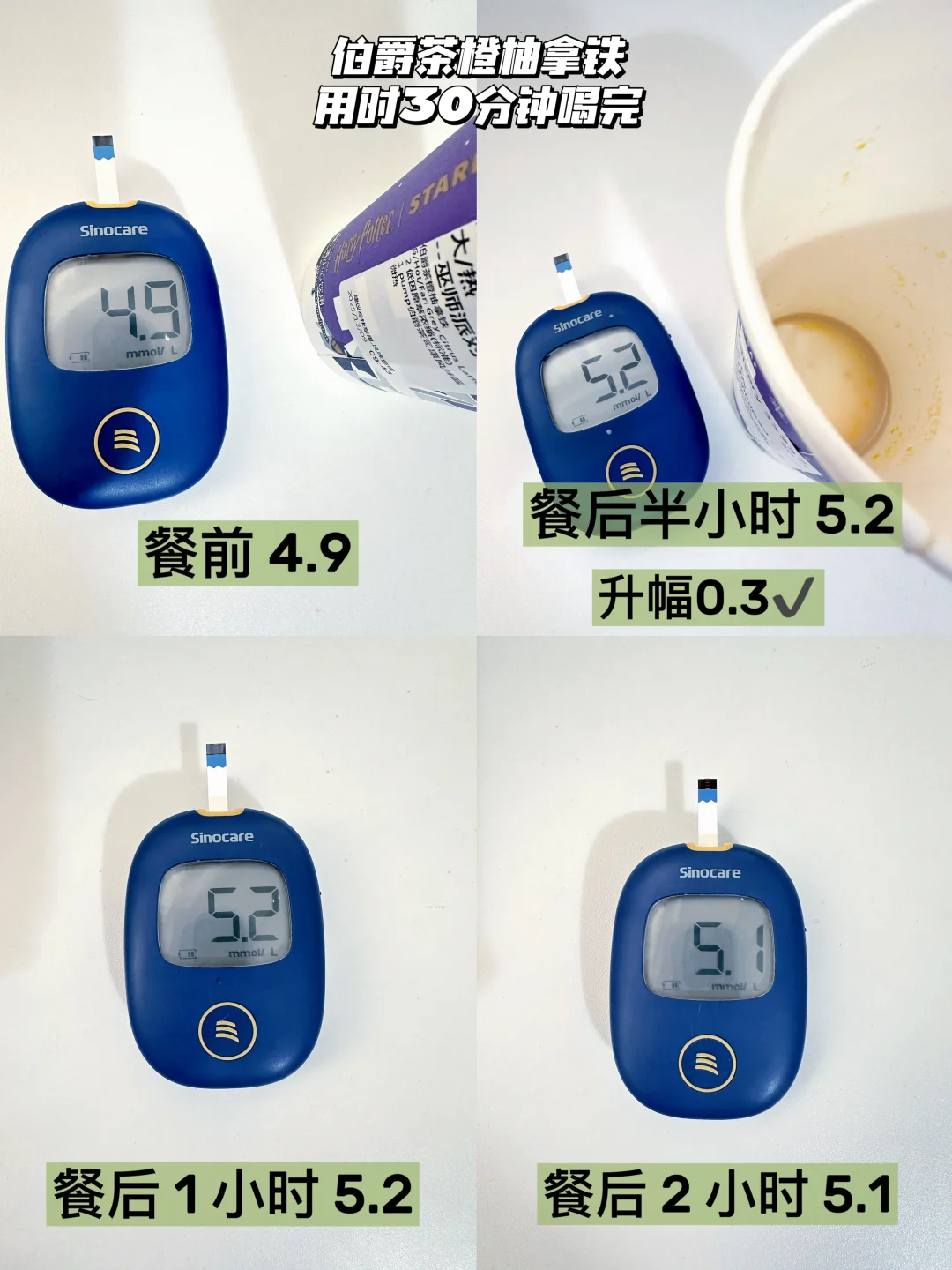 星巴克哈利波特联名的魔法咖啡系列升糖测试来咯[鼓掌R][鼓掌R] 本人的升糖小参照: 千人千糖 理性参考👀 吃100克馒头升幅3.8↑ 喝瑞幸老版橙C美式 🧊不另外加糖 5分钟喝完升幅3.4↑ 30分钟喝完升幅2.7↑ 1小时喝完升幅1.7✔ (不同饮用速度对升糖有不同的影响) [打卡R]伯爵茶橙柚拿铁 测试为: 大杯·热🔥1泵糖 全脂奶版 热量约245kcal 热量参考: 大杯·热🔥全脂奶版 4泵糖约323kcal 3泵糖约297kcal 2泵糖约271kcal 1泵糖约245kcal 热量参考来自 用时30分钟喝完🍬升幅0.3,友好哦✔ 1泵糖的甜度属于微甜的程度,橙柚的果香风味还挺明显的〰️升糖很友好哦,如果想要风味更足,可以尝试2泵糖〰️ [打卡R]焦糖酥塔风味拿铁 测试为: 大杯·热🔥1泵糖 全脂奶版 热量约342kcal 热量参考: 大杯·热🔥全脂奶版 4泵糖约420kcal 3泵糖约394kcal 2泵糖约368kcal 1泵糖约342kcal 用时30分钟喝完🍬升幅0.3,友好哦✔ 1泵糖属于微微糖的程度,焦糖的风味也能尝到〰️升糖很友好,如果不是极限控糖的宝子,推荐尝试2泵糖会更好喝✌🏻 [打卡R]莓莓覆盆子拿铁 测试为:大杯·去冰·不另外加糖 默认全脂奶 热量约318kcal 热量参考: 大杯·冰🧊 标准甜约397kcal 少甜约371kcal 不另外加糖/0卡糖约348kcal 用时30分钟喝完🍬升幅0.9,友好哦✔ 不另外加糖也是微甜的,喝起来还挺清爽的,升糖也很友好,喜欢莓果风味拿铁的宝子可冲✌🏻 🥂情况介绍:有家族🍬史,目前不是小🍬人🥂