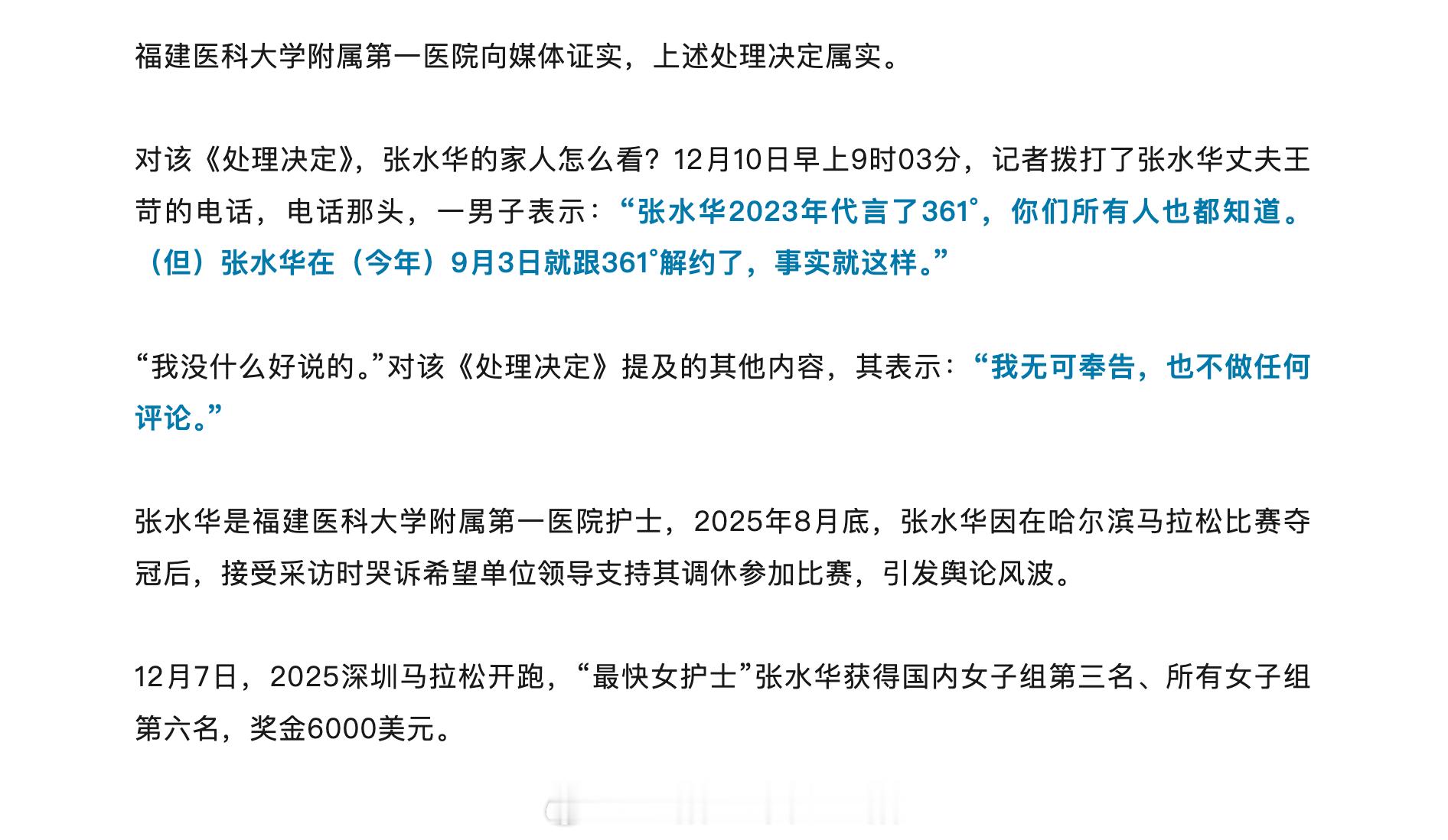 医院回应最快女护士张水华被处分 我一直以为张女士已经自愿离职了。原来还占着岗位。 其实以她的实力,完全可以做一个职业运动员,每年光是跑步奖金就大几十万收入了,还能顺便做一下产品代言,捞点广告费。跑马拉松就可以赚不少钱了,为啥还占着医院里的职位和资源 倨能聊