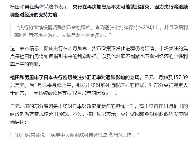 植田和男重磅表态:日本逐步接近通胀目标,未来将持续调整货币宽松 原文来自:华尔街见闻《日本央行行长植田和男:正逐步接近持续通胀的目标,暗示未来加息将“不止一次”》