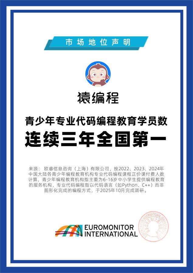 近日,权威市场调研机构欧睿信息咨询(上海)有限公司发布了最新调研结果,猿编程凭借其在青少年专业代码编程教育领域的卓越表现,荣获“青少年专业代码编程教育学员数连续三年全国第一”,充分彰显了猿编程在青少年编程教育市场的领先地位。欧睿作为全球领先的市场调研机构,至今已有20年的市场地位声明业务执行经验。
