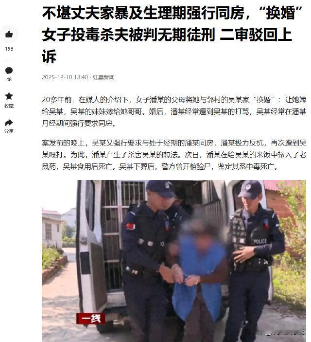 江西鹰潭,潘某家因三哥娶亲困难,在媒婆撮合下,与邻村吴某家“换婚”,24岁的潘某嫁到吴家,吴某妹妹嫁给潘某三哥,可婚后潘某生活苦不堪言,吴某性格暴躁,爱打牌赌博,还总因觉得“换婚”吃亏而对她非打即骂,还在潘某生理期强行提出要求。案发前一晚,吴某再次如此,潘某反抗遭殴打后起了杀心,次日,潘某在吴某米饭里掺老鼠药,吴某食用后离世。下葬后警方开棺验尸,最终确认是中毒而离世,潘某潜逃外地后,改名换姓打工,还嫁人生子。27年后,潘某在贵溪市被抓。 据红星新闻报道,20多年前,潘某家经济条件不好,三哥到了适婚年龄,却因为家庭贫困,一直找不到合适的结婚对象,娶亲成了家里的一大难题。 在那个年代,农村里“换婚”这种落后的婚姻形式偶尔还会出现,潘某的父母在媒婆的撮合下,无奈之下做出了一个决定,让24岁的潘某和邻村吴某家进行“换婚”。 就这样,潘某嫁到了吴家,而吴某的妹妹则嫁给了潘某的三哥。 本以为这桩婚姻能让两个家庭都解决难题,可没想到,吴某这个人性格十分暴躁,平时就爱打牌赌博,家里被他搞得乌烟瘴气。 他还总觉得在这场“换婚”里自己吃了亏,心里憋着一股气,只要一不顺心,就会把气撒在潘某身上,对她非打即骂。 更过分的是,在潘某生理期这种身体极度虚弱、需要照顾的时候,吴某竟然还强行提出要求,完全不顾潘某的身体和感受。 案发前一晚,吴某又一次在潘某生理期强行要求,潘某实在无法忍受,进行了反抗。 可这一反抗,换来的却是吴某更加猛烈的殴打。潘某被打得遍体鳞伤,心里充满了绝望和愤怒,那一刻,她起了杀心,想要结束这痛苦的生活。 第二天,潘某趁着吴某不注意,在他要吃的米饭里掺了老鼠药。 吴某毫无察觉地吃下了这有毒的米饭,没过多久,毒性发作,最终离世。 吴某下葬后,民警觉得事情有些蹊跷,于是开棺验尸,经过仔细的检验,确认吴某是因为中毒才离世的。 潘某知道自己犯了不可饶恕的罪,为了逃避法律的制裁,她选择了潜逃。 潘某改名换姓,跑到外地去打工。 在打工的过程中,她经人介绍,嫁给了刘某,还和刘某生了两个儿子。 可她心里清楚,自己犯下的罪行,随时都可能被抓。 27年过去了,潘某以为自己可以一直这样隐姓埋名地生活下去,可法网恢恢,疏而不漏。 最终,潘某在江西贵溪市被抓获归案。 那么,以法律的角度该如何看这件事呢? 根据《刑法》规定,故意杀人的,处死刑、无期徒刑或者十年以上有期徒刑;情节较轻的,处三年以上十年以下有期徒刑。 在这起案件中,潘某因为长期遭受吴某的打骂和虐待,在反抗过程中起了杀心,用投毒的方式将吴某杀害,其行为符合故意杀人罪的构成范畴。 虽然她的婚姻生活很不幸,但这并不能成为她杀人的理由,任何人都不能以非法的方式剥夺他人的生命。 最终,法院经过审理认定,潘某犯故意杀人罪,判处无期徒刑,剥夺政治权利终身,同时让她赔偿死者家属5万余元。 婚姻不幸,确实会给人带来巨大的痛苦,但遇到问题一定要通过合法合理的途径去解决,而不是采取极端的暴力手段,否则不仅会伤害他人,也会让自己陷入不可悔。 您对这件事有什么看法呢?