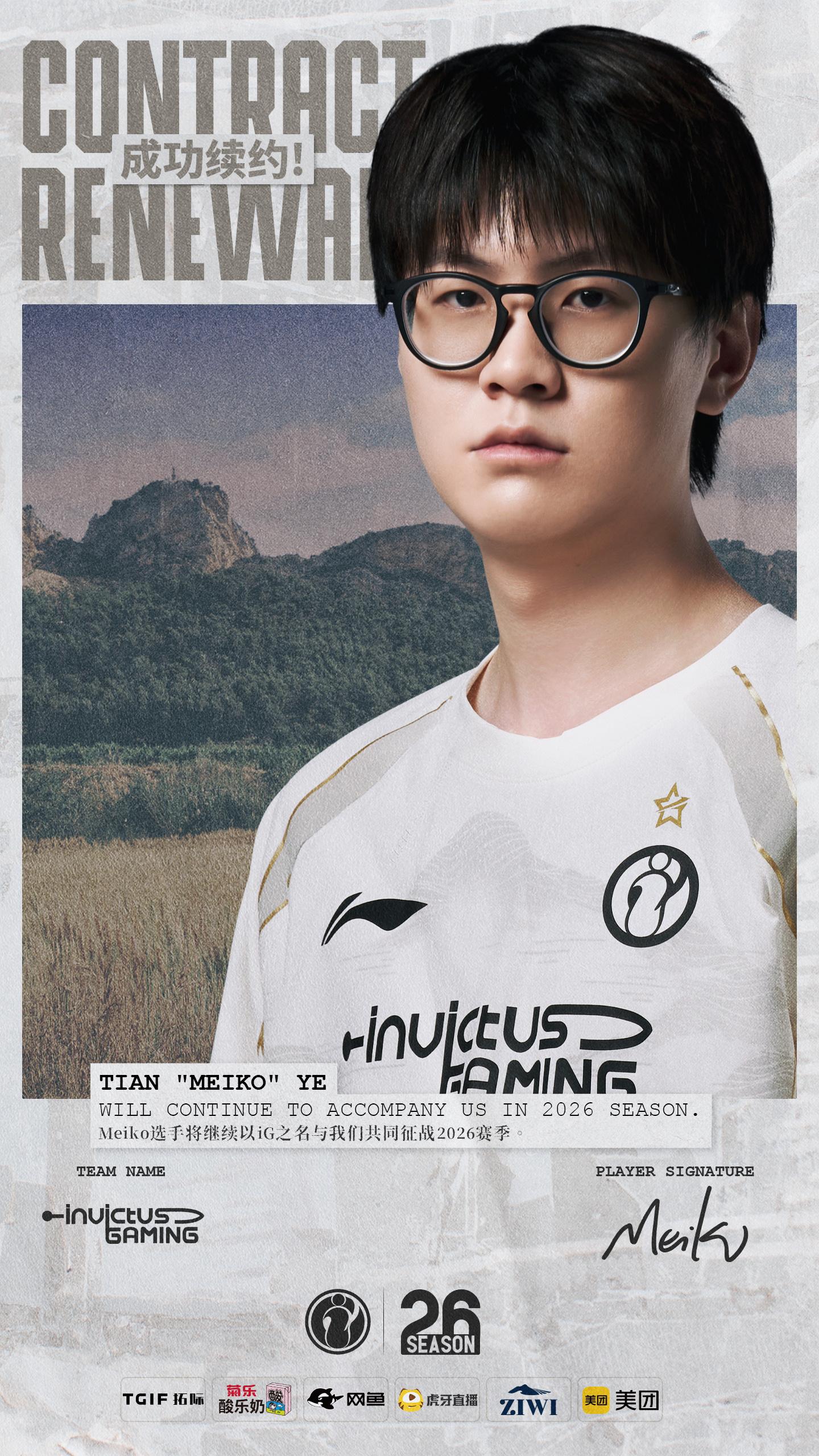 iG发布人员变动公告:辅助选手Meiko完成续约