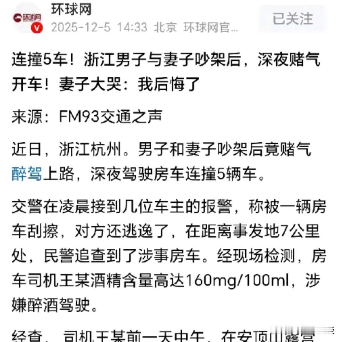 浙江杭州,夫妻俩开着房车约朋友一起去露营,酒过三巡后,妻子当众数落丈夫,没给他留半点情面,两人吵得不可开交。散局后,男子越想越憋屈,感觉在朋友跟前颜面尽失,里倒歪斜开走房车,接连撞了5辆车,被抓后酒精含量达160mg/100ml,直接刑拘。妻子哭着后悔不该赌气,男子却大不一样,坦然承认所有事,半点不反悔。 冲动是魔鬼,一步错步步错。王先生和妻子约朋友一起到安顶山露营聚餐,和好友相聚、惬意又放松。 没想到,夫妻俩发生口角,王先生酒后赌气开房车下山,连撞5车后继续前行,最后闹到刑拘收场。 谁也没能料到,夫妻俩几句不起眼的拌嘴,好好的露营欢聚,最后落得满盘皆输的结局。 事发那天天气正好,微风不燥,阳光柔和地洒在山间,王某特意带着妻子,还喊上几位要好的朋友,一起去安顶山露营散心。 白天的时候,几个人围着满眼的青山绿水,吹着山间清爽的风,一边聊天打趣,一边欣赏沿途美景。 嘻笑打闹满是惬意,氛围格外融洽暖心,谁都没想着后续会出岔子。 他们找了个好位置,摆上备好的酒菜,酒杯碰得叮当响,大家说说闹闹,热闹得很。 王某正陪着朋友喝酒聊天,妻子却突然想起备好的香肠,熟食忘带了,她有点生气,就埋怨丈夫几句。 丈夫不以为然,觉得没有外人带啥吃啥,妻子气头上,翻起了旧账,当着所有朋友的面,指着王某的鼻子就数落起来。 语气又急又冲:“你怎么总这么不上心!这点小事都办不好”话一出口,桌上瞬间安静下来,大家都有些不知所措。 妻子越说越上头,刺耳的数落声一句接一句,让王某在朋友面前颜面尽失,刚才还满心头的惬意,瞬间被怒火烧得一干二净。 一开始他还顾及面子,咧着嘴假笑,后来皱着眉隐忍不吭声,可妻子越说越激动,专挑解气的话说。 王先生终究忍无可忍,反正也没了面子,那就一起丢 人。跟妻子大吵起来。 好好的聚餐闹得鸡飞狗跳,朋友们劝也劝不住,最后只能早早各自收拾东西,不欢而散。 入夜后,王某躺在房车里翻来覆去睡不着,妻子白天当众指责他的画面在脑海里反复浮现,心里又憋又气。 加上聚餐时喝了不少酒,酒精不断催化着怒火,让他彻底失去了理智。 压根忘了自己喝了酒不能开车的规矩,满脑子就一个念头,赶紧离开这个让他难堪的地方。 于是,他踉跄着爬到驾驶座,启动房车就往山下冲。 山间道路本就崎岖多弯,视线不佳,酒精早已让王某反应迟钝、视线模糊,眼前的景象晃得厉害,可他全然不管不顾,一门心思往前开。 没开多远,就撞上了第一辆车,巨大的撞击力让房车晃动不已。 可王某丝毫没有停车处理的想法,踩着油门继续往前冲,短短几公里连撞5辆车。 然而,肇事房车没有丝毫停顿,撞完最后一辆车后,径直加速逃离现场,被撞车主对着受损的爱车不知所措。 车主们回过神后,赶紧报警求助。交警接警后迅速行动,凭借沿途监控和线索,很快锁定了肇事房车的轨迹。 最终在距离事故现场7公里外,成功将肇事司机王某拦下。 刚打开车门,浓烈的酒味就扑面而来,王某满脸通红、眼神迷离,说话颠三倒四,醉态尽显,一看就是喝了不少酒。 后续酒精检测结果显示,王某体内酒精含量高达160mg/100ml,远超80mg/100ml的醉驾标准,涉嫌危险驾驶罪,当场被交警刑拘。 得知王某被刑拘,妻子匆忙赶到现场,看着狼藉的事故现场和被交警控制的丈夫,悔恨不已。 她崩溃大哭着质问王某:“你怎么这么糊涂!”她既懊恼自己不该当众和王某争吵,伤了他的面子,更自责没能拦住酒后的王某开车,才酿成如此大祸。 但是,面对妻子的崩溃痛哭,王某却满脸淡然,全程冷漠,甚至直言自己完全不后悔。 一场休闲露营,只因一时口角和冲动,不仅撞坏了别人的车,毁了自己的生活,还触犯了法律,付出了刑拘的代价。 喝酒不开车、开车不喝酒是底线,一时的情绪失控,换来的却是无尽的代价,王某的教训,值得所有人警醒。 那么从法律的角度,该如何看待这件事呢? 《刑法》第133条之一,危险驾驶罪,在道路上驾驶机动车,有下列情形之一的,处拘役,并处罚金:(二)醉酒驾驶机动车的。 王某聚餐时大量饮酒,酒精检测含量达160mg/100ml,远超80mg/100ml的醉驾标准,且驾驶房车在山间道路行驶,属于在道路上醉酒驾驶机动车,已构成危险驾驶罪。 王某醉酒驾驶违反交通运输法规,接连撞坏5辆车,造成公私财产损失,已发生交通事故。 且肇事后未停车保护现场、处理事故,反而加速逃离,属于交通运输肇事后逃逸。 若其造成的财产损失达到“重大损失”标准,可认定为交通肇事罪,即便未达重大损失,逃逸行为也会作为危险驾驶罪的从重量刑情节。 对于王某的行为,你怎么看呢? @静心法谈 学法辨是非,慬法不吃亏。