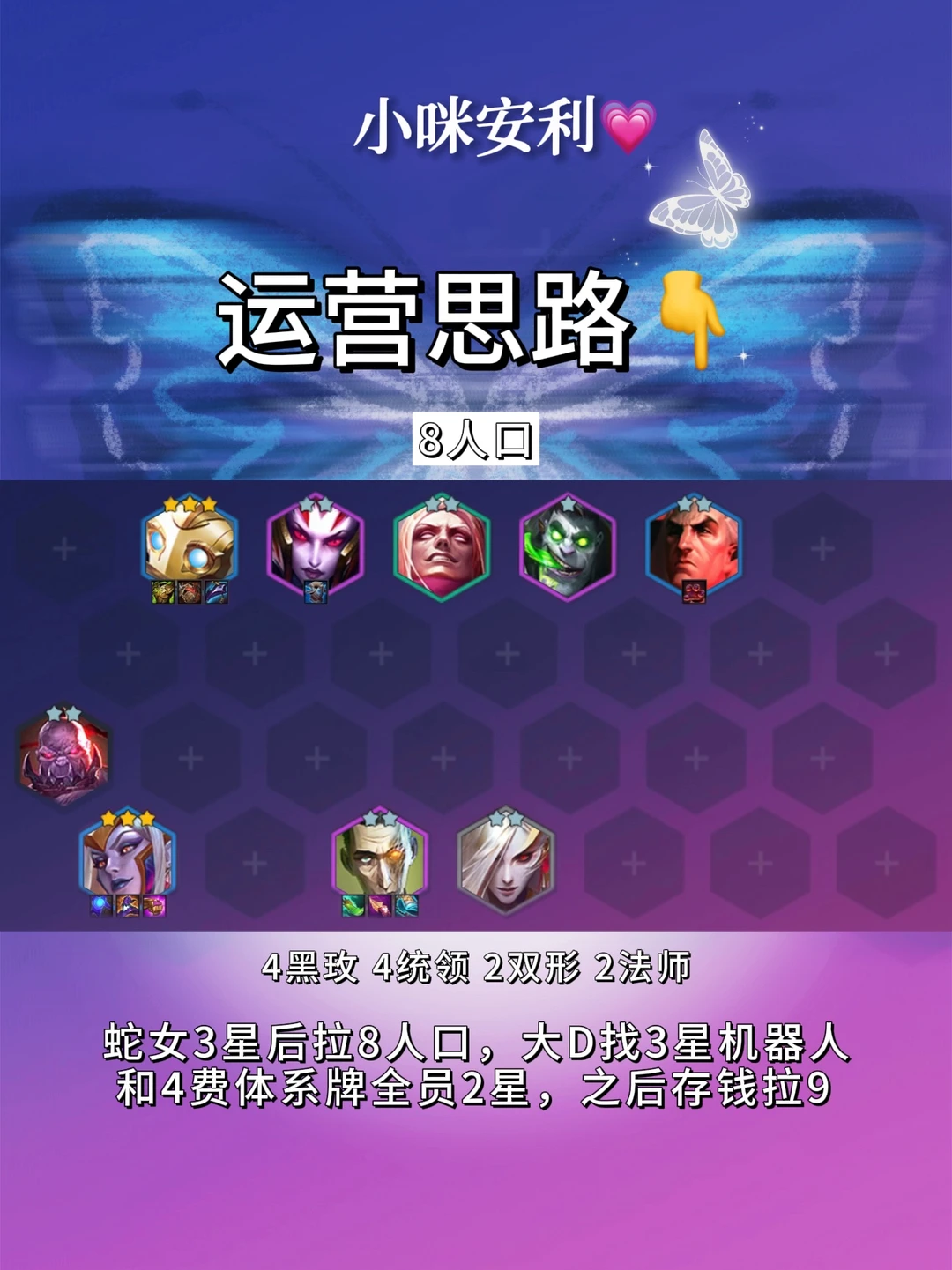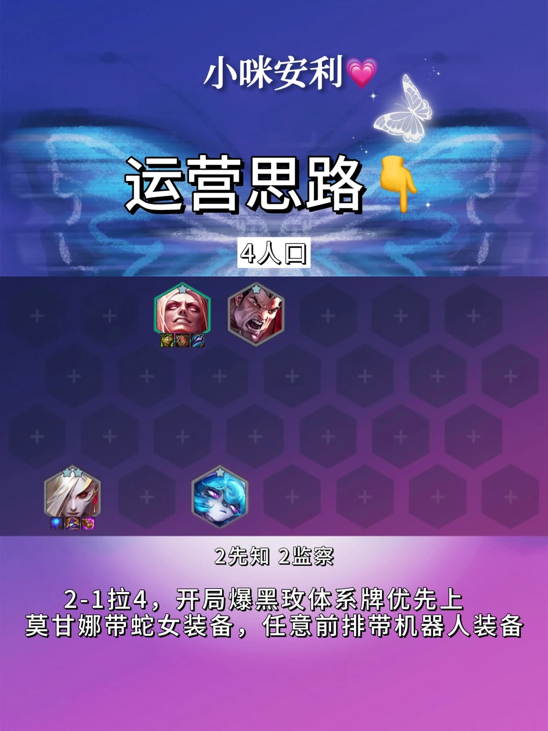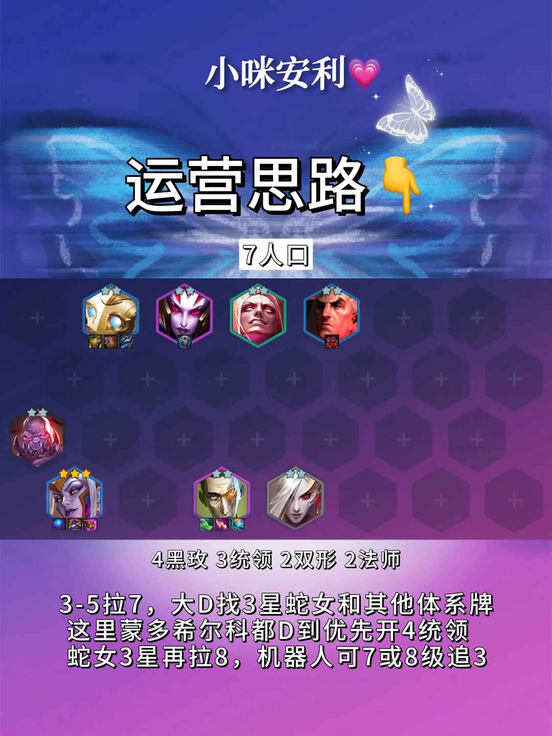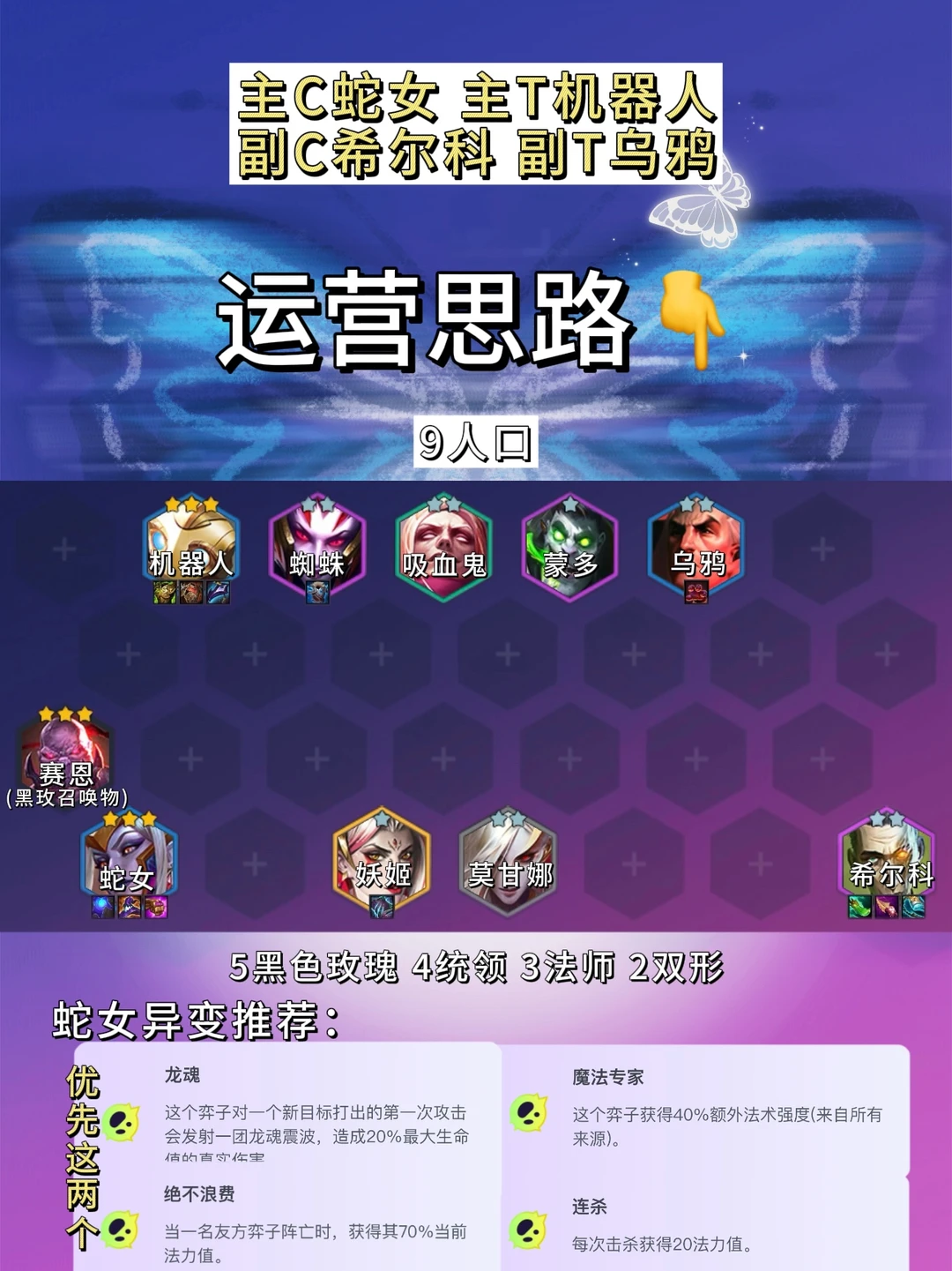 🌟s13双城传说本命年蛇女!仅当版本适用! 🌟建议前期法系装备多or开局爆黑玫体系牌冲! 🌟海克斯推荐2战力1经济!海克斯拿启动法强类!可按推荐拿! 🌟异变给蛇女!最好是龙魂或绝不浪费! 🌟运营思路👇 2️⃣阶段2-1拉4,2-5拉5!不D牌白嫖体系牌过渡! 3️⃣阶段3-2拉6,3-5拉7!7人口大D找3星蛇女和体系牌!蛇女3星再拉等级! 4️⃣阶段8人口开4统领!异变给蛇女! 5️⃣阶段有经济9人口上妖姬开5黑玫!阵容大成!