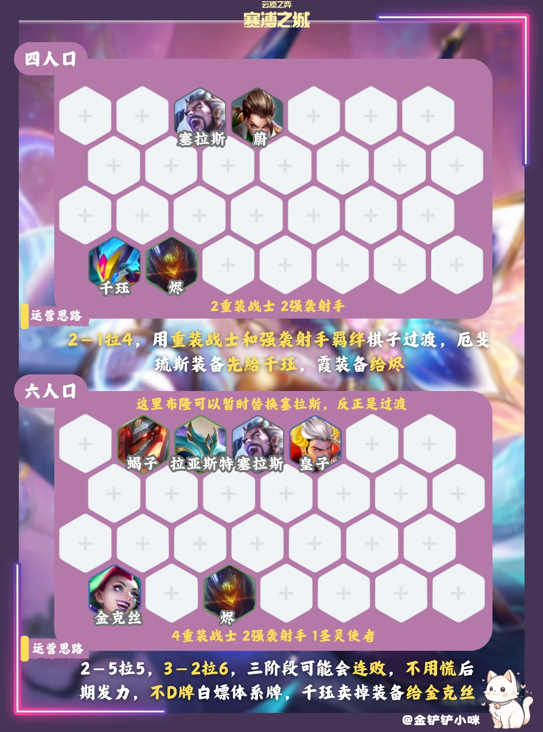2️⃣阶段2-1拉4,2-5拉5!前期找强袭射手和重装战士羁绊棋子过渡即可,最好前期能合羊刀过渡很舒服!