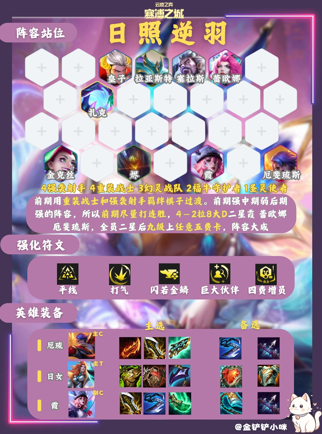 🎈浅谈:这套阵容过渡简单只需要无脑找强袭射手和重装战士羁绊棋子过渡就好,成型强度也很高,唯一缺点就是中期疲软可能会掉很多血量需要注意!