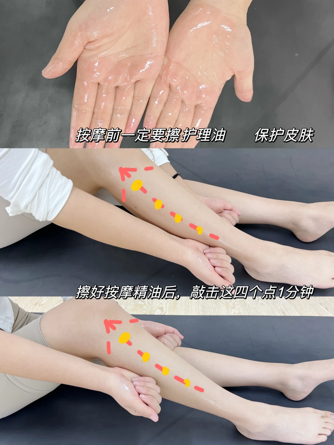 接着拉伸按摩小腿肌肉,千万不能干搓哦!一定要配合护理油按摩!事半功倍!避免拉扯皮肤和造成肌肉腿的同时更好塑造腿部线条,我用过很多款护理油,还是喜欢用oceanwell的护理油,吸收非常快。秋冬还可以涂抹全身,肉眼可见皮肤光滑细腻了,性价比贼高!