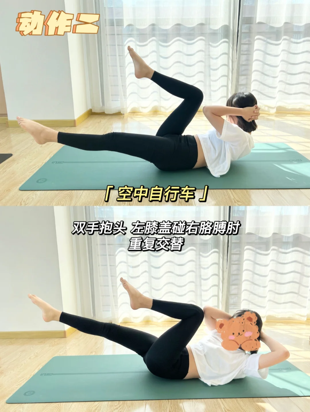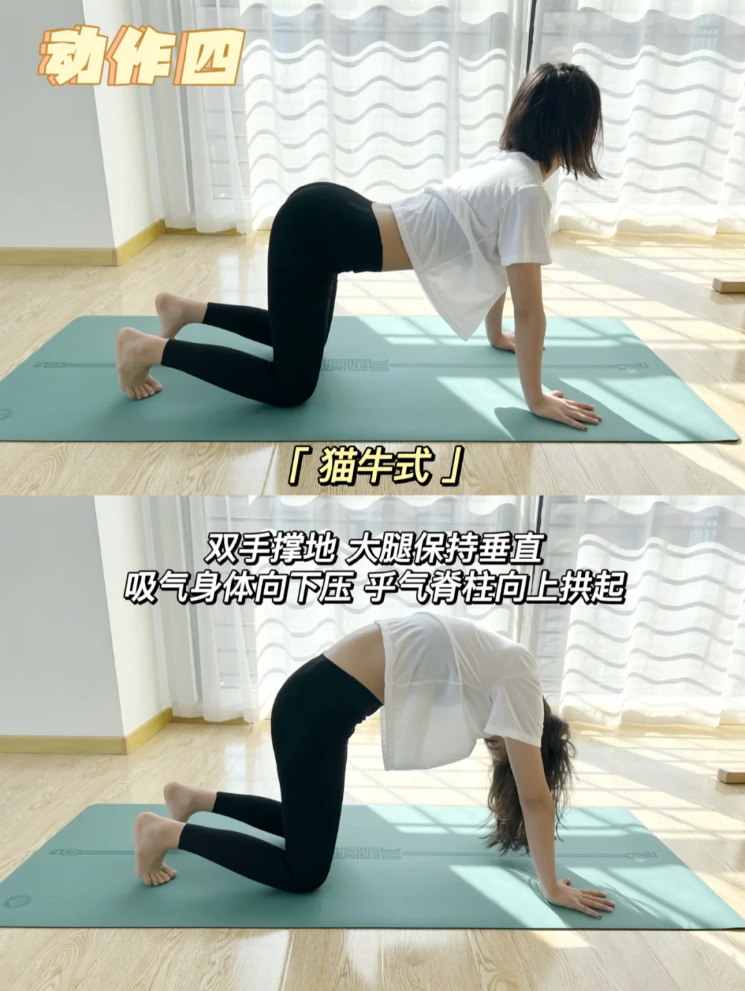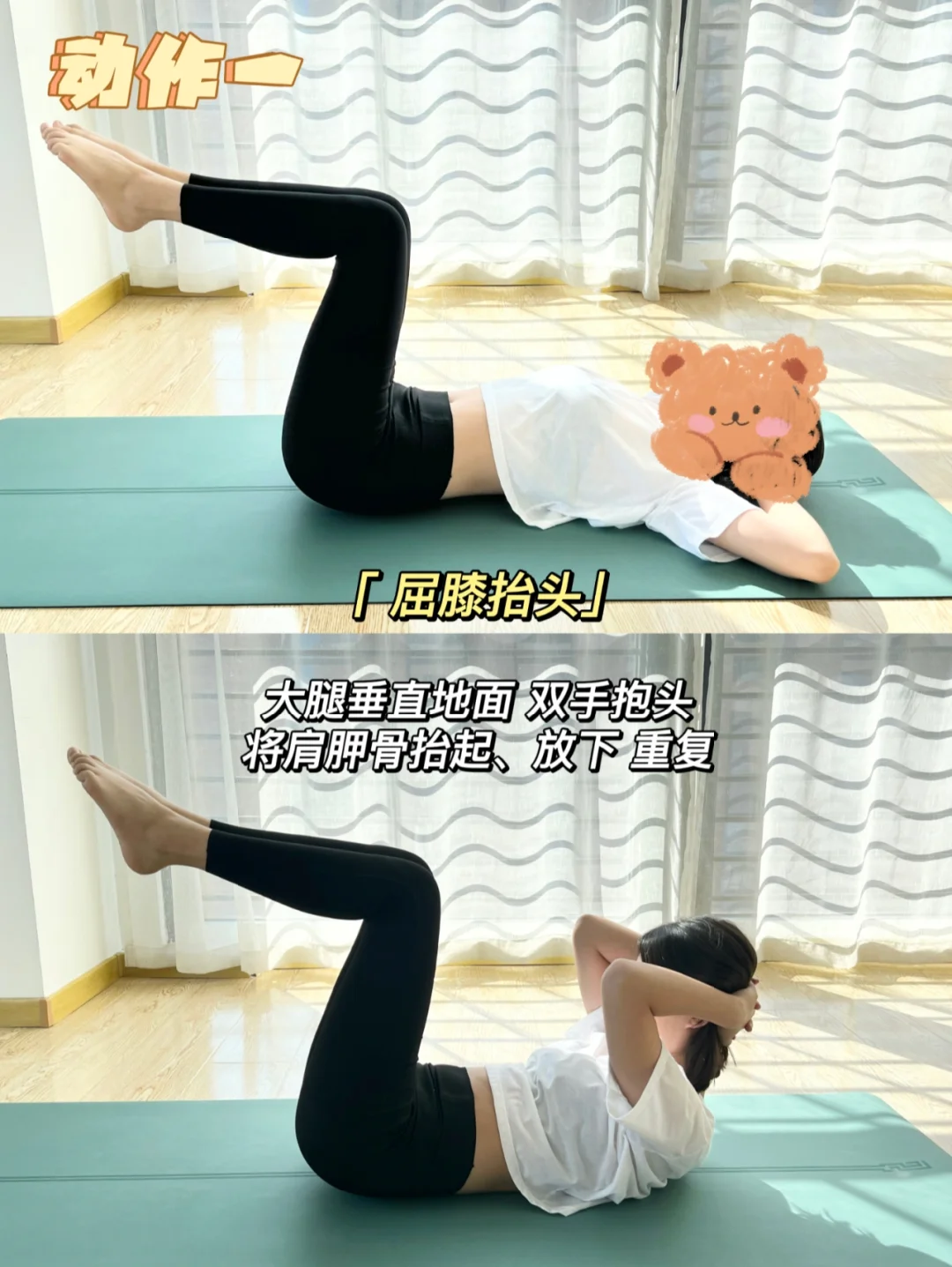 √动作一:屈膝抬头30下 大腿垂直地面,双手抱头,将肩胛骨抬起,然后 放下,重复 √动作二:空中自行车30下 双手抱头,用左膝盖碰右胳膊肘,重复交替 √动作三:侧卧转体30下 左侧卧,髋关节呈90°,手压住膝盖,旋转胸椎重复 √动作四:猫牛式30下 双手撑地,大腿保持垂直,吸气身体向下压,呼 气脊柱向上拱起 每个动作练2组,坚持打卡2周,就能看到明显 改善!快冲~
