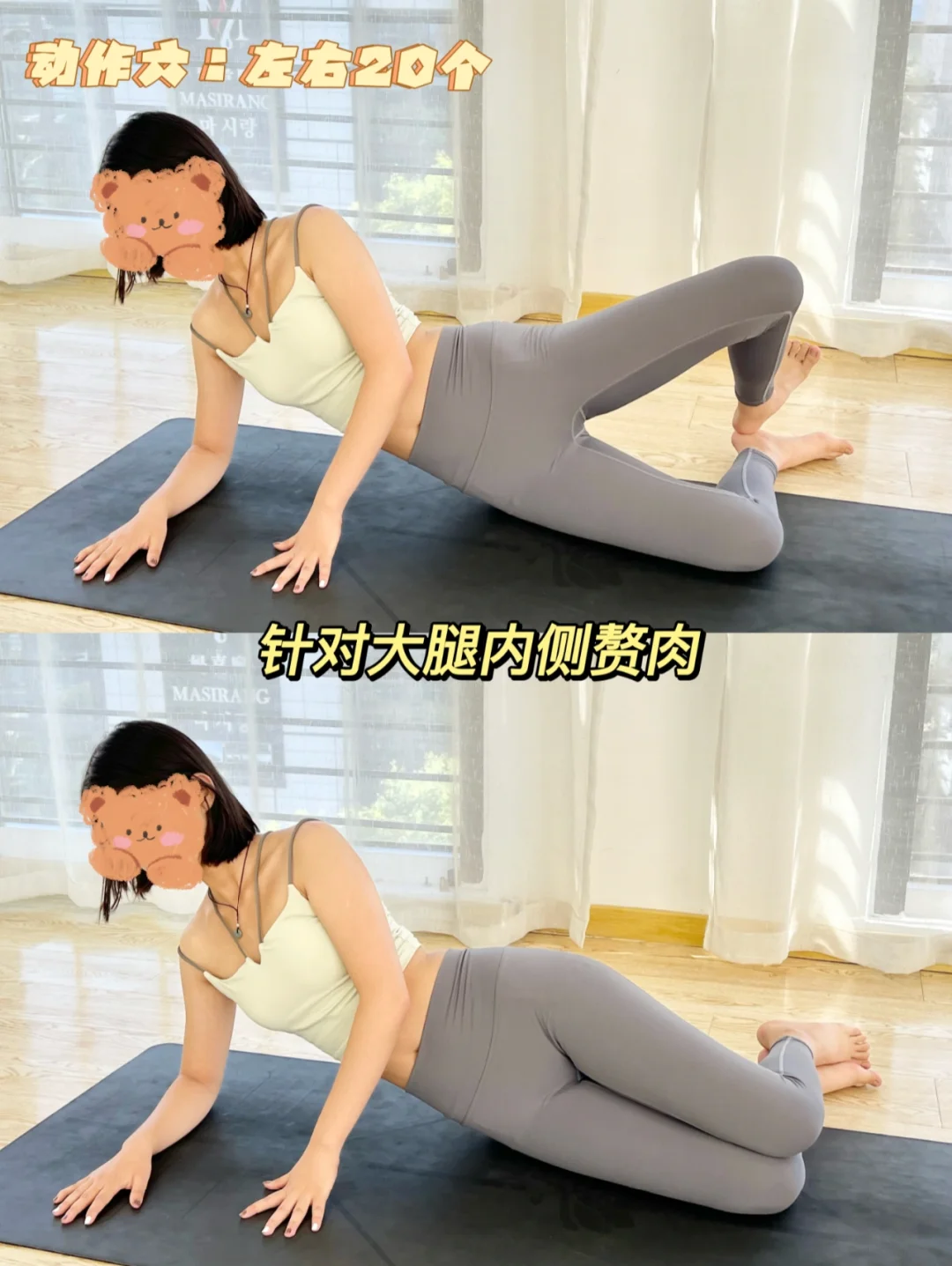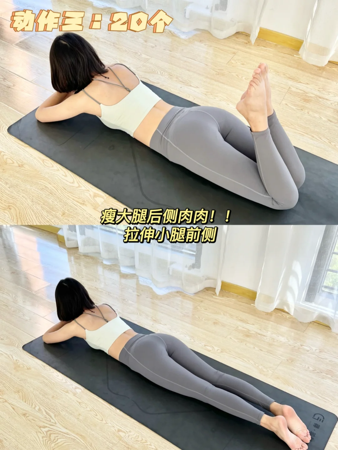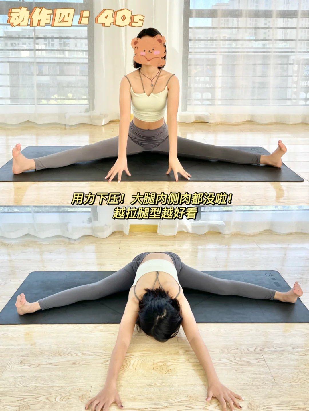 动作:30s(瘦大腿前侧突出练!) 动作二:30s 动作三:20个(瘦大腿后侧肉肉) 动作四:40s(越拉腿越好看) 动作五:左右各20个(改善腿型,瘦大腿内侧 哦) 动作六:左右20个 每天练会亲测有用!一起瘦腿吧