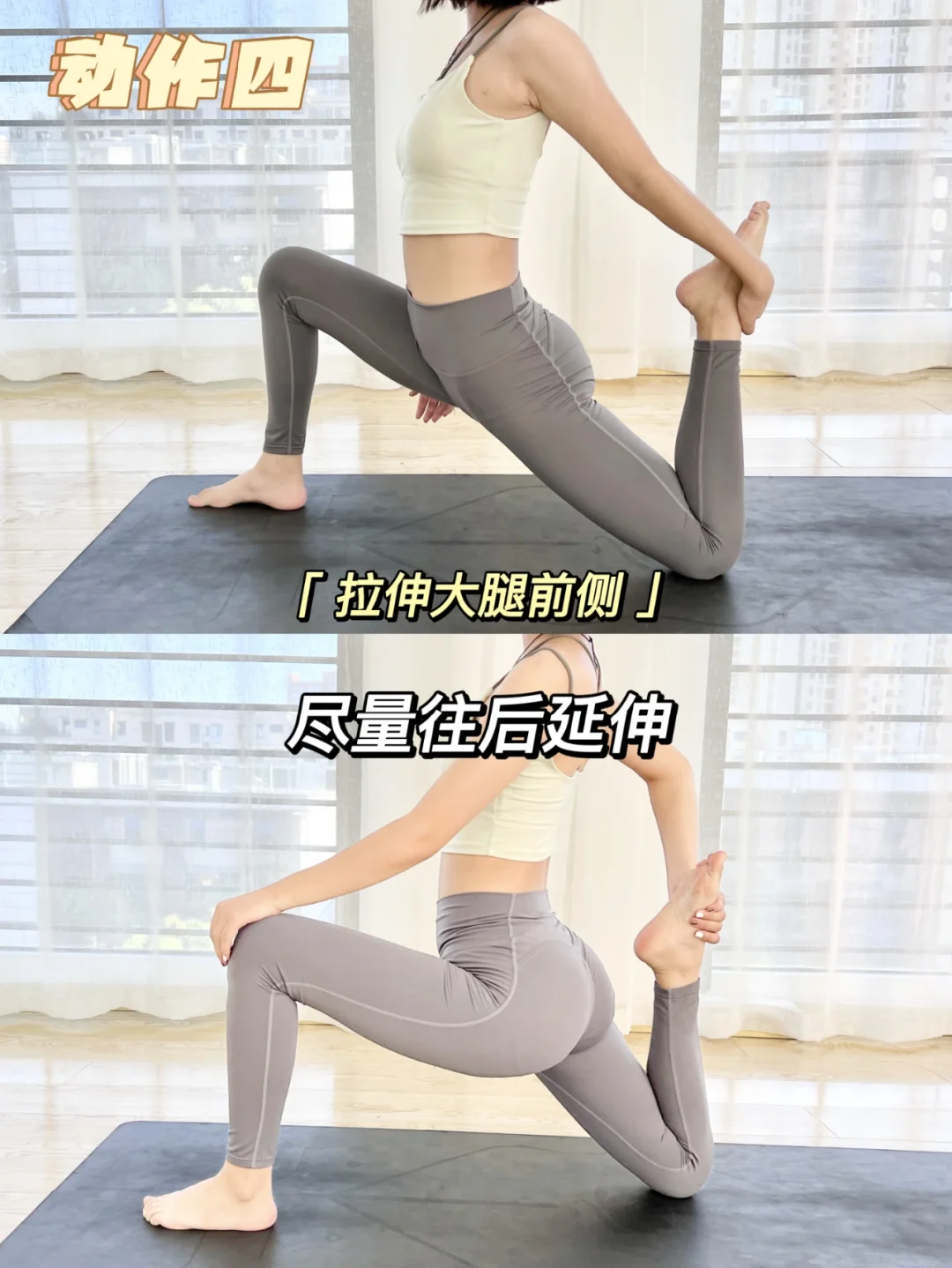 上身胯骨随支撑腿前移,手向后握住脚踝将脚踝拉向臀部,被拉伸大腿前侧有酸胀感