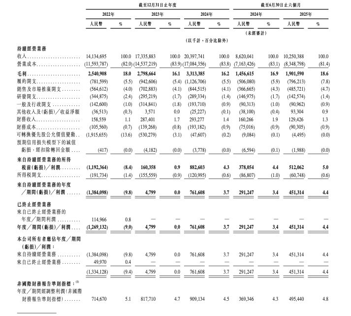 2022-2024年及今年上半年,京东工业持续经营业务的收入分别约141.35亿、173.36亿、203.98亿、102.50亿元;毛利分别约25.41亿、27.99亿、33.13、19.02亿元,毛利率分别为18.0%、16.1%、16.2%、18.6%;来自持续经营业务的净利润分别约-13.84亿、479.9万、7.62亿、4.51亿元,净利润率分别为-9.8%、0、3.7%、4.4%;经调整净利润(非国际财务报告准则指标)分别约7.15亿、8.18亿、9.09亿、4.95亿元,经调整净利润率分别为5.1%、4.7%、4.5%、4.8%。