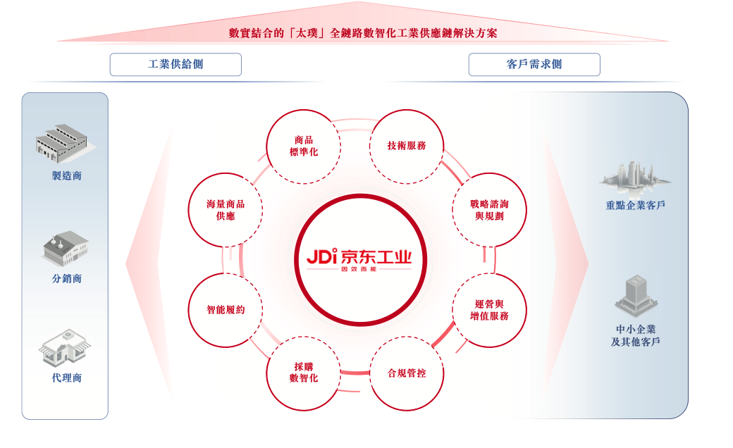 具体而言,京东工业通过“太璞”这一“数”(数智)、“实”(商品)结合的全链路数智化工业供应链解决方案,提供广泛的工业品供应和数智化供应链服务,以满足客户的多样化需求。“太璞”建立在其端到端的供应链数智化基础设施之上,涵盖商品、采购、履约及运营,公司主要通过向客户销售工业品及提供相关服务获得收入。