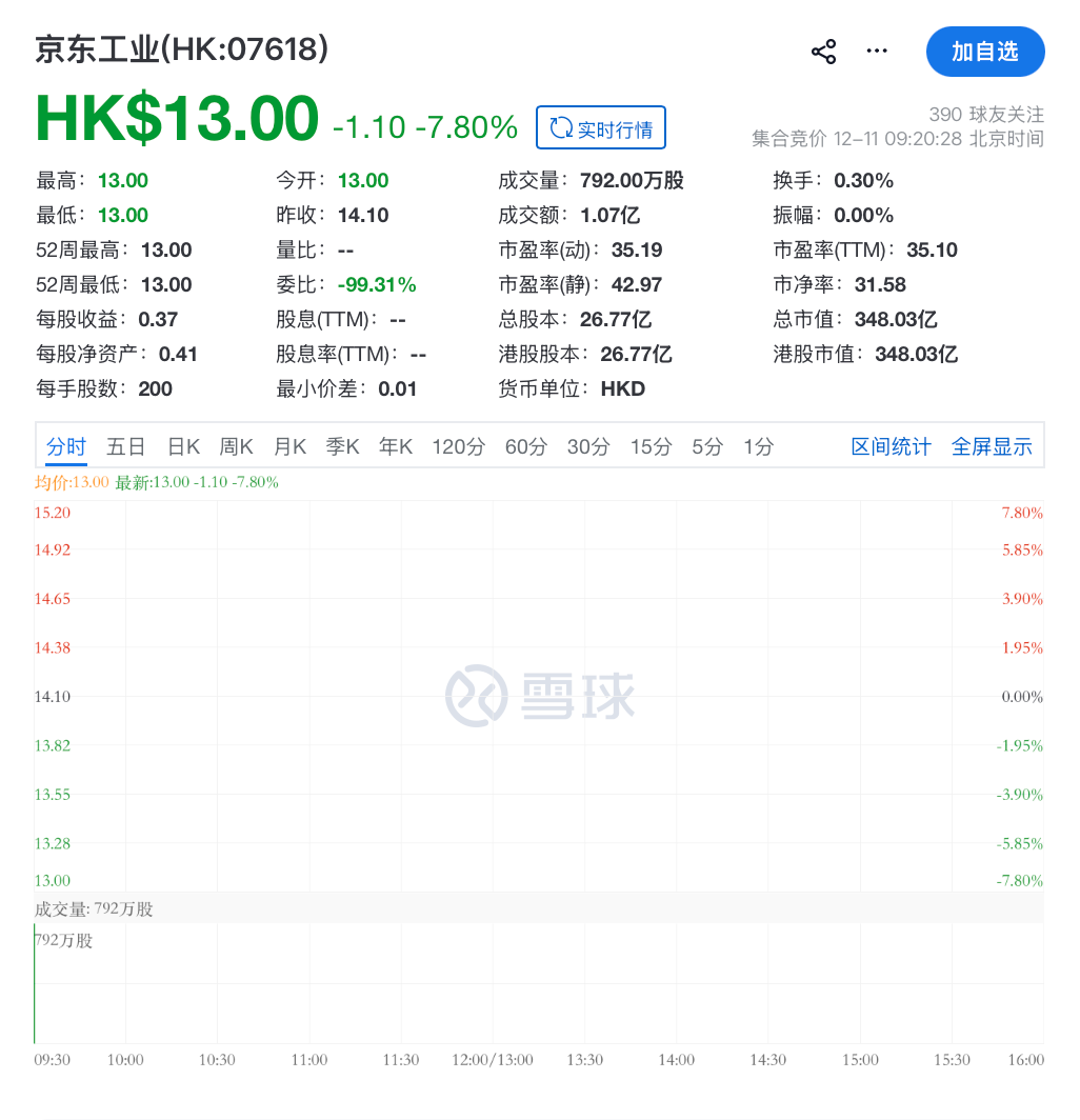 今日开盘,京东工业跌7.80%,报13港元/股,总市值348.03亿港元。