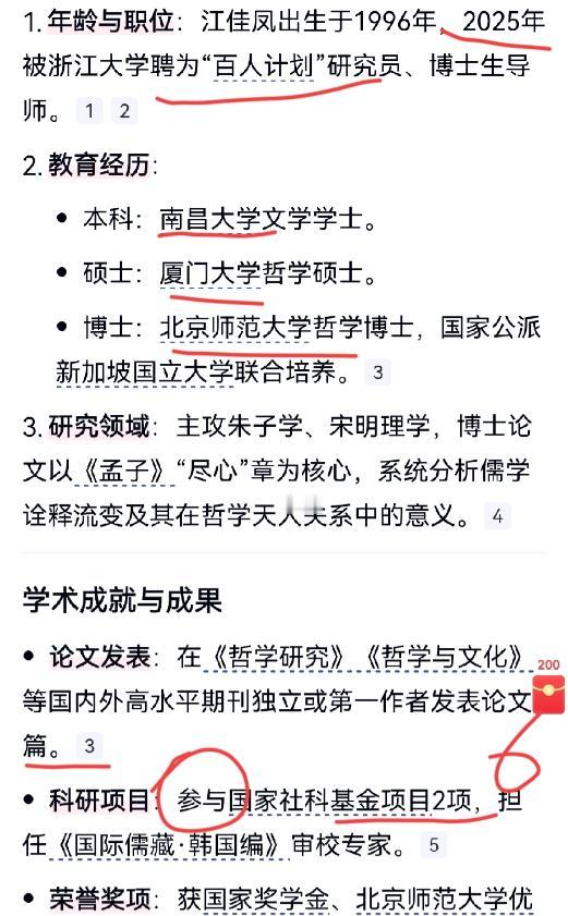 闵超博导已够震撼!没想到96年出生的江佳凤博导更炸裂!是百人计划,不是新百人,前者难度更大,结果研究成果看完石化了!浙江真是藏龙卧虎啊! 这就是神神叨叨的东西魅力所在,反正没法量化,牛不牛全凭领导一句话,你换成理科那些就麻烦了! 朱子学,宋明理学,这种研究究竟有何实际意义?算你研究到最高境界了好吗,但对国家发展社会进步有多少作用? 看样子,中国很快又会出现孔子一样的世界级哲学大师了,这一个个年轻的样子着实可怕,不知道哲学博导能不能选院士?如果能的话,估计只算哲学院士都可以排满科学院和工程院了吧?