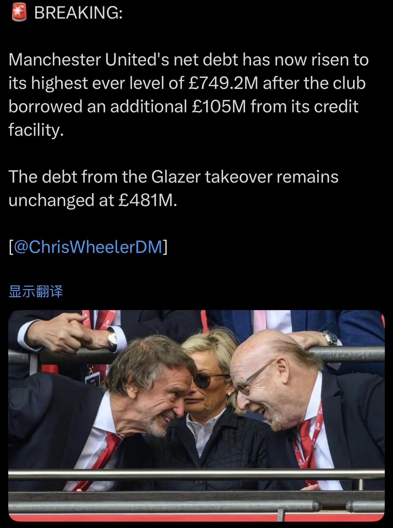 再下去,曼联的财务状况就要变巴萨喽[发怒],问题是人家巴萨至少竞技层面上,还是世界一流的[捂脸] 成绩拉垮,还欠那么多钱,6666 ……………………………………………………………… 突发新闻: 曼联俱乐部从其信贷额度中额外借入 1.05 亿英镑后,其净债务已升至历史最高水平 7.492 亿英镑。 格雷泽收购案产生的债务仍为 4.81 亿英镑。