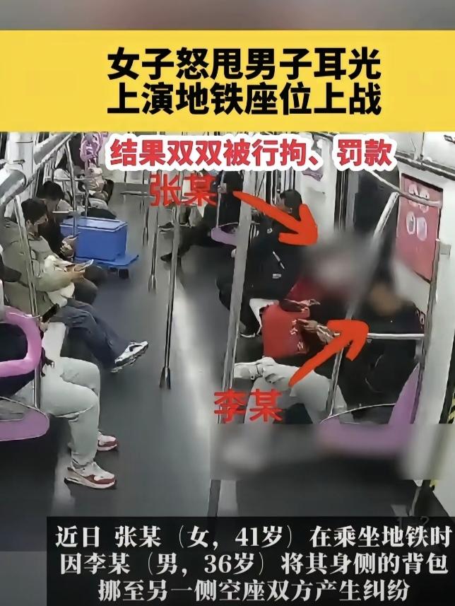 男子乘地铁时,看到座位上有个包,旁边还有一个空位置,男子就坐下,然后把座位上的包放在旁边的空位上。 谁知这个再平常不过的举动却惹恼了旁边穿红衣服的女子,女子的下一步举动让男子忍无可忍。 女子看到男子把她的包挪到旁边那个空位上,二话没说上去给了男子一耳光。 男子懵了,从小到大没人打过他耳光,在大庭广众之下,竟然因为一个座位被陌生的女子打了一个耳光,是可忍孰不可忍,男子奋起反击,打的红衣女子狼狈不堪。 虽然后来男子和红衣女子都被刑拘,罚款,但是我觉得男子不会后悔,再有一次男子还会如法炮制。 地铁座位又不是你家专属的,拿个包占座本来就没道理,人家好心挪开包坐下来,你倒好,直接动手打人,这脾气也太爆了!换谁被当众扇耳光都得炸毛,这反击看着解气,就算最后被处理,估计换谁都得这么干,毕竟这口气实在咽不下去! 各位读者你们怎么看?欢迎在评论区讨论。