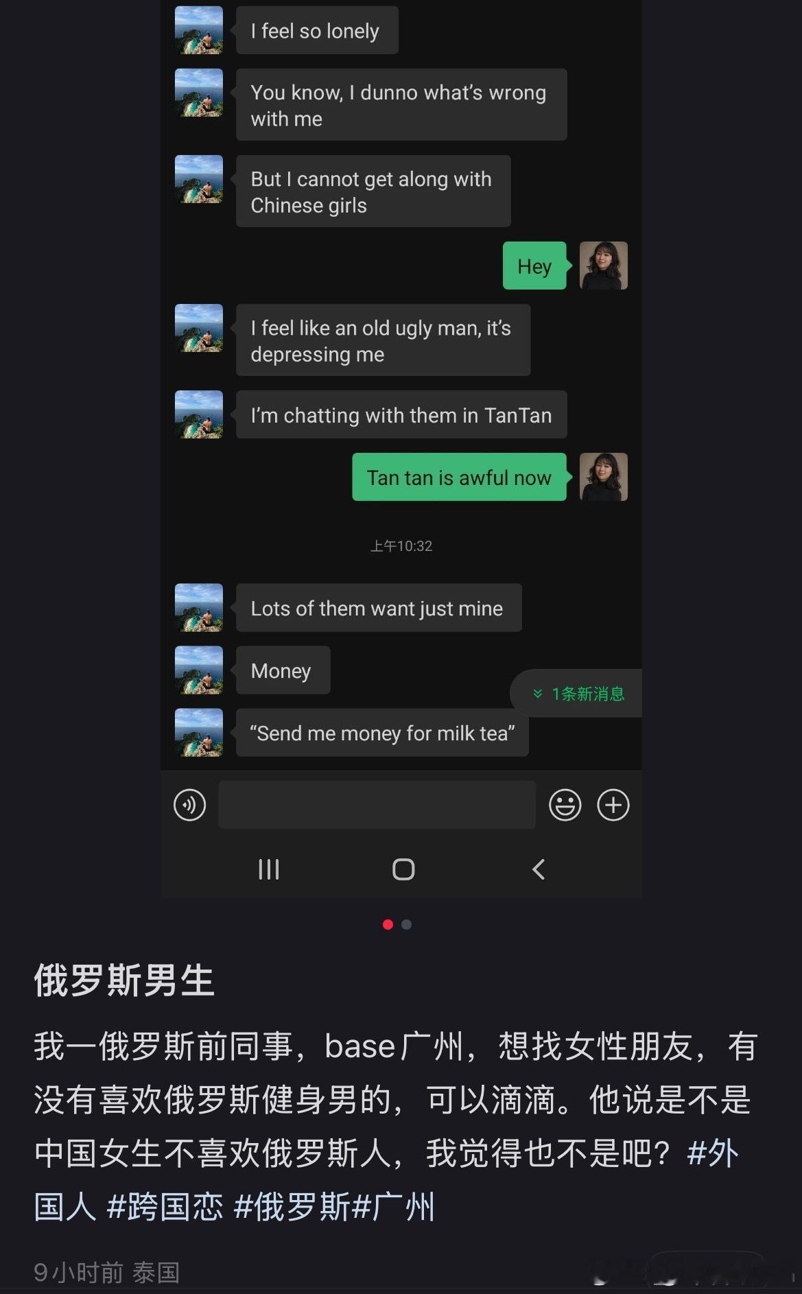 我的白男朋友现在小红书用得飞起,经常刷到某些中国人帮外国人找对象的帖子。他表示非常不理解,中国优秀的人那么多为什么有些人非得倒贴扶贫条件很差的白男白女我说你别问我,我也不理解他今天给我截了一张中国人帮俄罗斯四十多岁大叔找对象的帖子,这男的一边嫌弃女生让他请喝奶茶是“图他的钱”,一边说自己没人喜欢。这么大岁数没什么成就又没钱还不帅,凭什么要别人喜欢啊