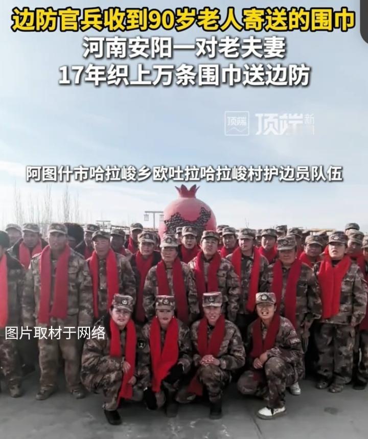 17年织万条围巾!九旬夫妇的坚守,才是中国边疆最暖的“护城河” 当泰柬边境冲突持续一周,数十万人流离失所,我们更懂“边疆安稳”四个字有多沉重。河南安阳的九旬夫妇赵中福和张娥梅,用17年光阴织就上万条围巾,跨越千里送往边关,这份朴素的坚守,恰是国泰民安的最好注脚。 2008年,老两口在电视上看到边防官兵顶着风雪站岗,心疼得睡不着觉:“咱能做的,就是让孩子们多一份暖”。从此钩针成了日常,晴日在院子里织,阴雨天就凑在灯下赶工,钩针磨坏了好几把,毛线用了一卷又一卷,堂屋的旧地图上,红笔标注的寄送点早已铺满边疆线 。更让人动容的是,这份善举已传五代——从抗美援朝时为志愿军纳鞋底,到如今重孙辈跟着学织围巾,赵家的针线里,藏着中国人最纯粹的家国情怀。 战士们的回应同样戳心:新疆克孜勒苏柯尔克孜自治州的官兵戴着红围巾敬礼,额尔古纳的战士在信里说“围巾暖了脖子,更暖了守边的心”,他们寄来的雪莲花、边疆细沙,成了老人最珍贵的收藏。如今孙子赵长河主动请缨戍边新疆,用青春守护爷爷牵挂的土地,这双向奔赴的温暖,正是军民同心的生动写照。 看看动荡的国际边境,再想想我们的边疆:有战士手握钢枪的坚守,也有百姓一针一线的牵挂。没有天生的岁月静好,只是有人替我们戍守风雪,有人用平凡善举筑牢后盾。这上万条围巾,织的是牵挂,连的是山河,更是“犯我中华者虽远必诛”的底气所在。 你身边有这样温暖的拥军故事吗?你觉得普通人能为边防做些什么?欢迎在评论区分享~ 老夫妻17年为边防官兵织上万条围巾 军民同心护家国