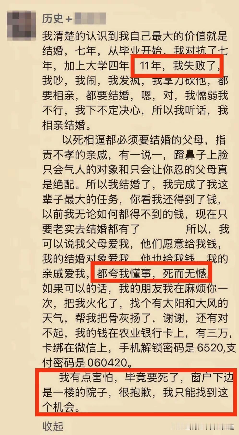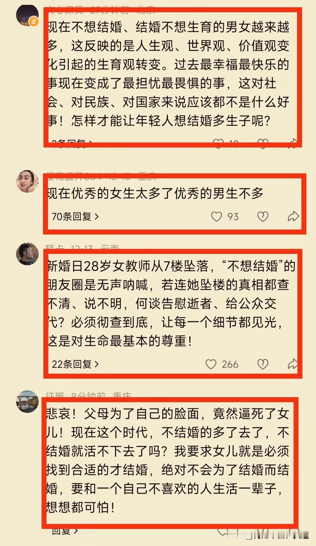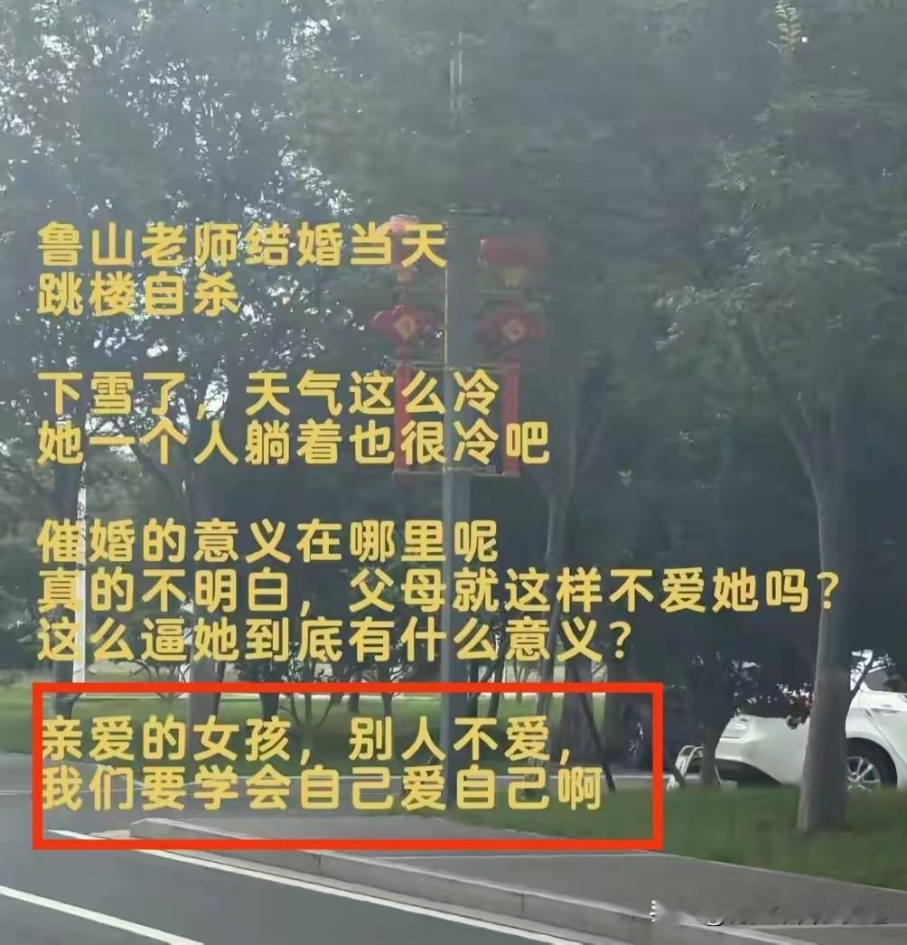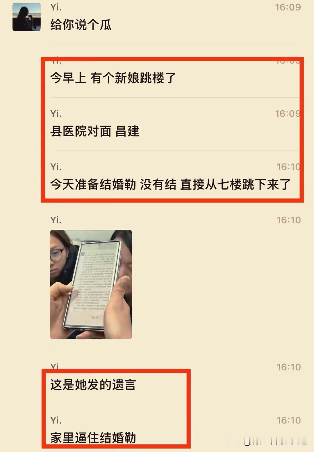 现代社会还有“包办婚姻“? 河南平顶山。新娘在结婚当日跳楼自杀。 新娘是一所高中的历史老师,人很漂亮又善良,被家人逼迫结婚,但这不是她所愿。从结婚照能看出,没有一丝笑容。可悲的是,新娘在第二天才被送去殡仪馆,没人为她收尸,娘家说女儿已出嫁,夫家说新娘没娶到家。 可见,没有人真的心疼新娘。难道,人不结婚就没有活路吗?现在大城市,多少年轻人独身,活得都挺好,家人也都支持。看来现代文明没到河南。 新娘是正式在编的老师,养活自己毫无压力,家人就不能听取她的意见吗?如今,香消玉殒,家人开心了?新娘脱离家人的掌控也是幸事一件。