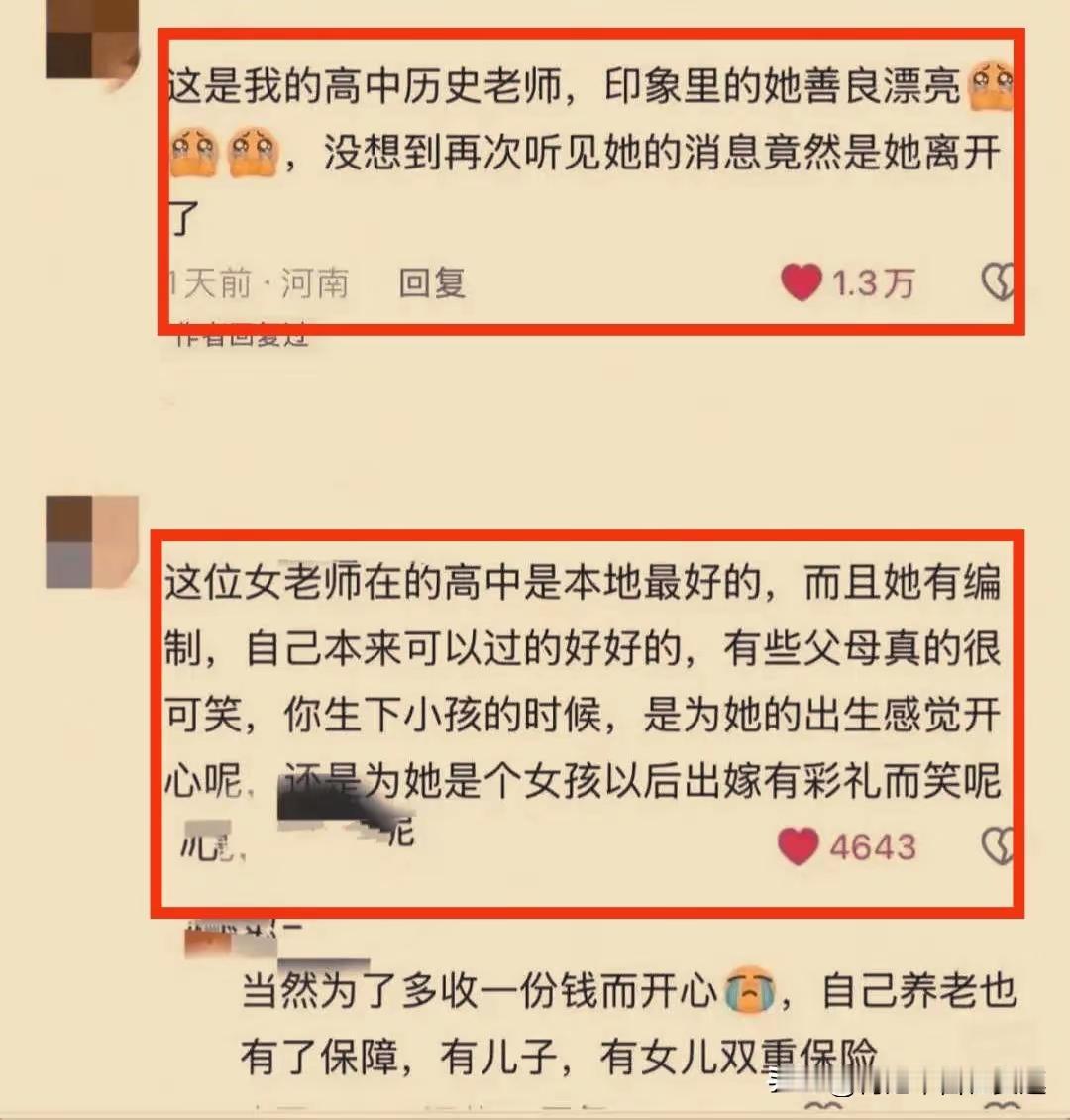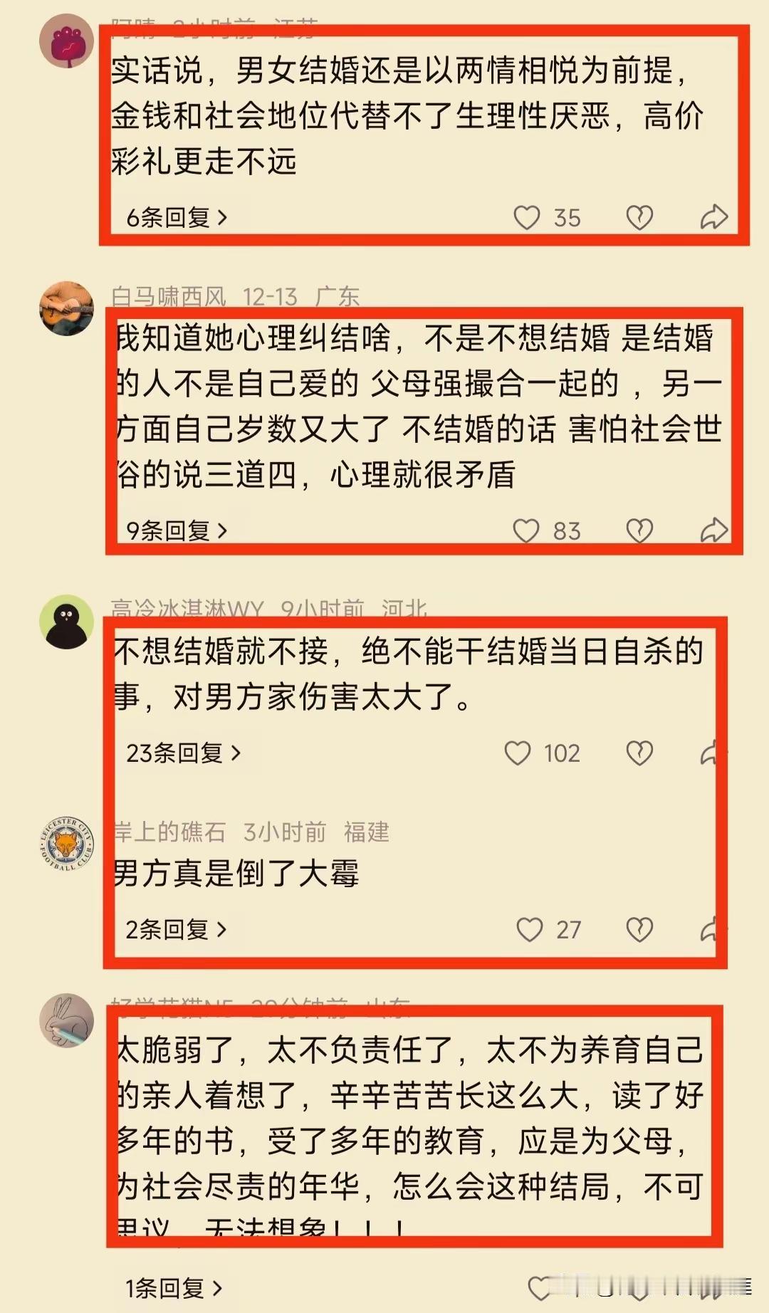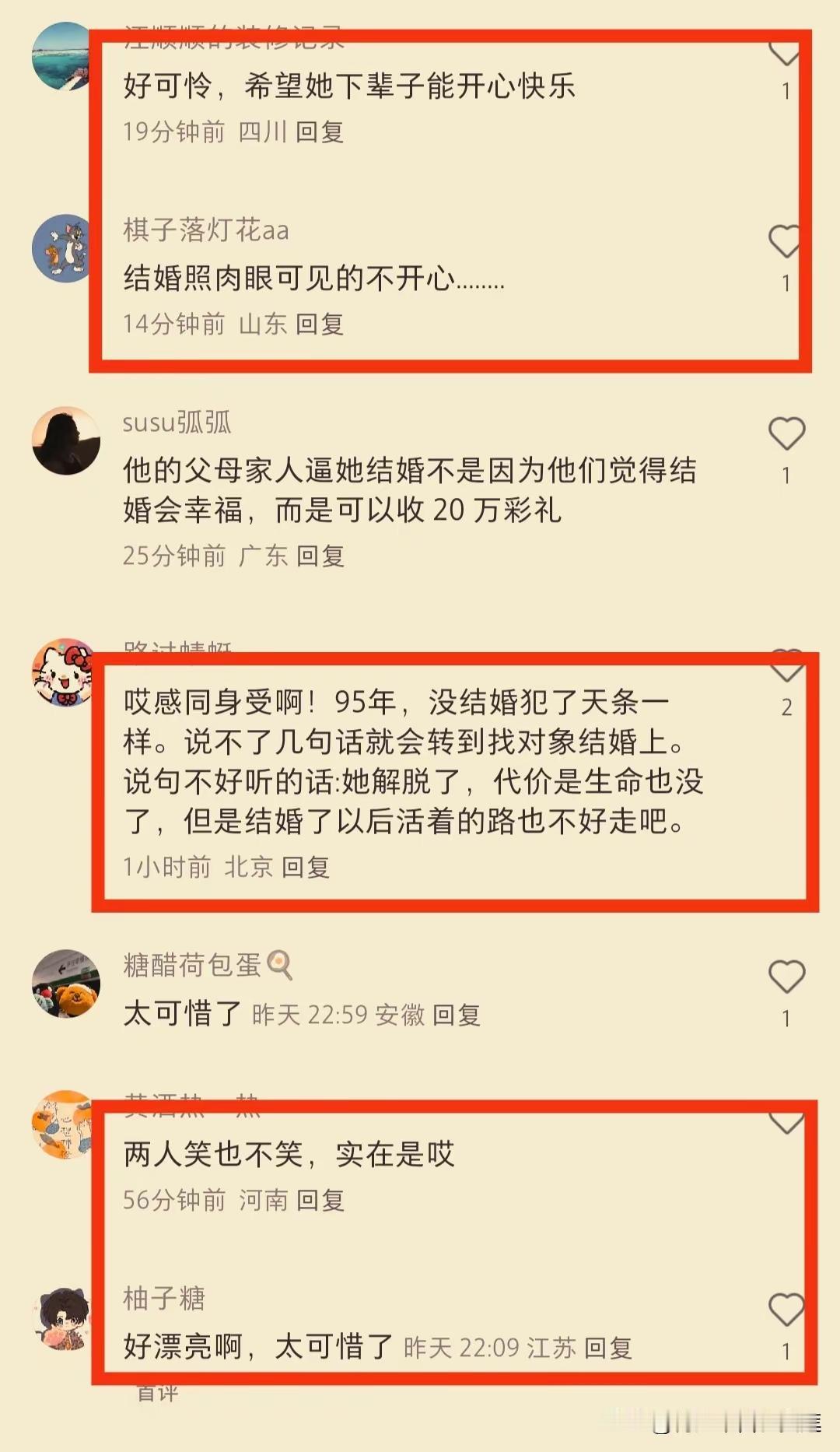 现代社会还有“包办婚姻“? 河南平顶山。新娘在结婚当日跳楼自杀。 新娘是一所高中的历史老师,人很漂亮又善良,被家人逼迫结婚,但这不是她所愿。从结婚照能看出,没有一丝笑容。可悲的是,新娘在第二天才被送去殡仪馆,没人为她收尸,娘家说女儿已出嫁,夫家说新娘没娶到家。 可见,没有人真的心疼新娘。难道,人不结婚就没有活路吗?现在大城市,多少年轻人独身,活得都挺好,家人也都支持。看来现代文明没到河南。 新娘是正式在编的老师,养活自己毫无压力,家人就不能听取她的意见吗?如今,香消玉殒,家人开心了?新娘脱离家人的掌控也是幸事一件。