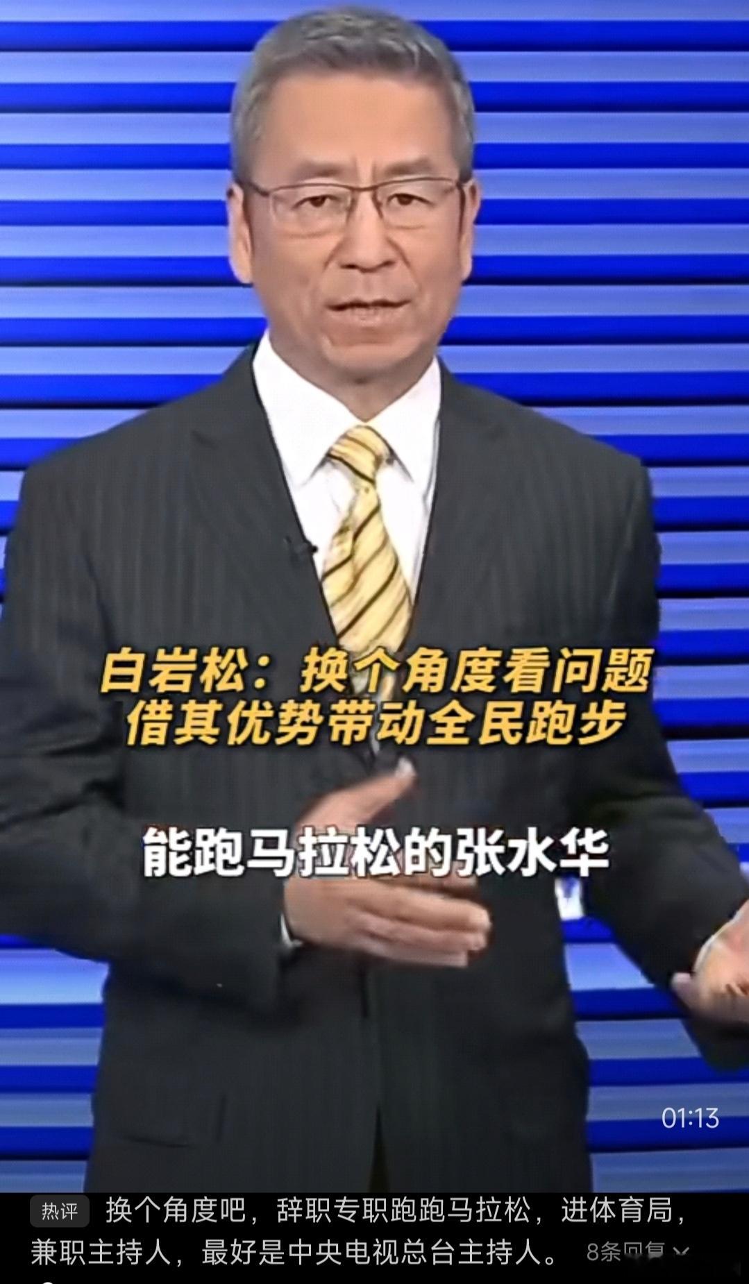 刚有朋友转了一个视频,是白岩松老师建议换个角度看张水华被处分的问题。他说因为张水华成绩好,经过专业训练可能创造更好的成绩。所以,建议医院领导适当减少张水华当护士的时间,让她带动医院医生护士还有福州市民跑步。这是什么逻辑,成绩好,可以培养,不应该转为职业运动员吗?三甲医院要一个马拉松冠军有什么用?能证明医术高超?还是能鼓舞员工士气?大家都学她把副业搞得风生水起,本职工作谁干? 白岩松谈张水华被处分