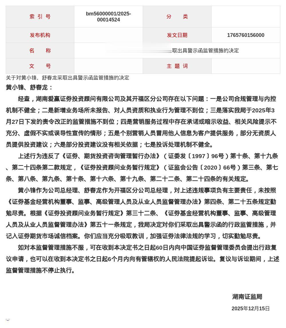 蓝鲸新闻12月15日讯,近日,湖南证监局发布行政监管措施决定书,剑指湖南爱赢证券投资顾问有限公司及相关责任人。