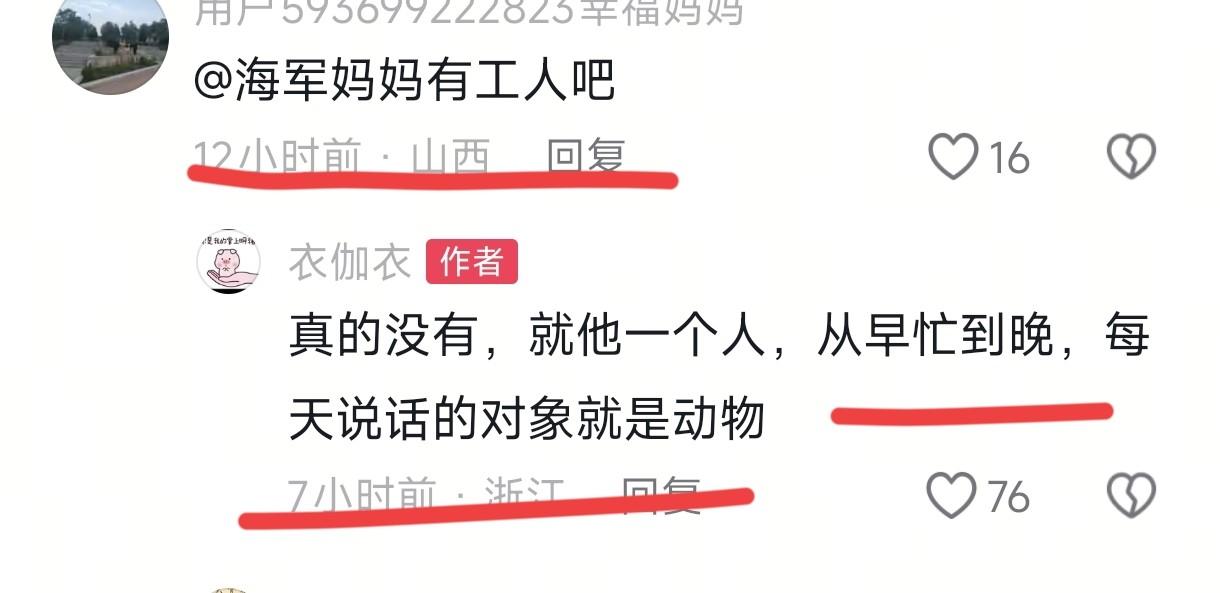 大家不禁感叹,海军妈妈农场养了这么多动物,一个人怎么忙得过来?肯定是要找工人的。