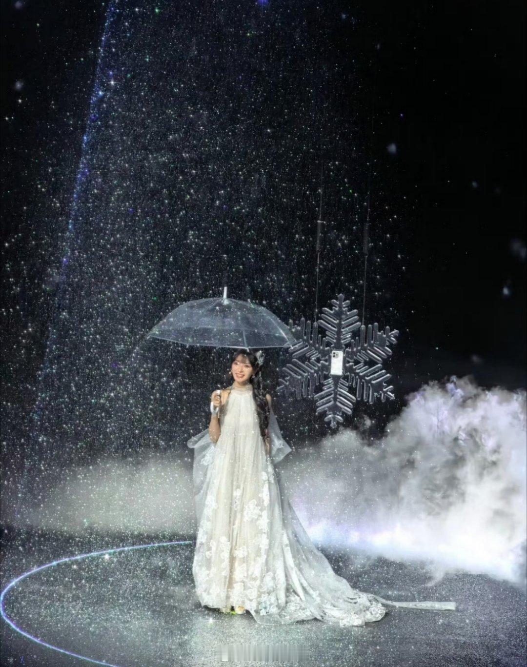 哇哦,田曦薇这个在雪花漫天飞舞的舞台上,撑着伞出场,整个就是一个绝美啊,像白雪公主一样的出场,谁能不爱啊