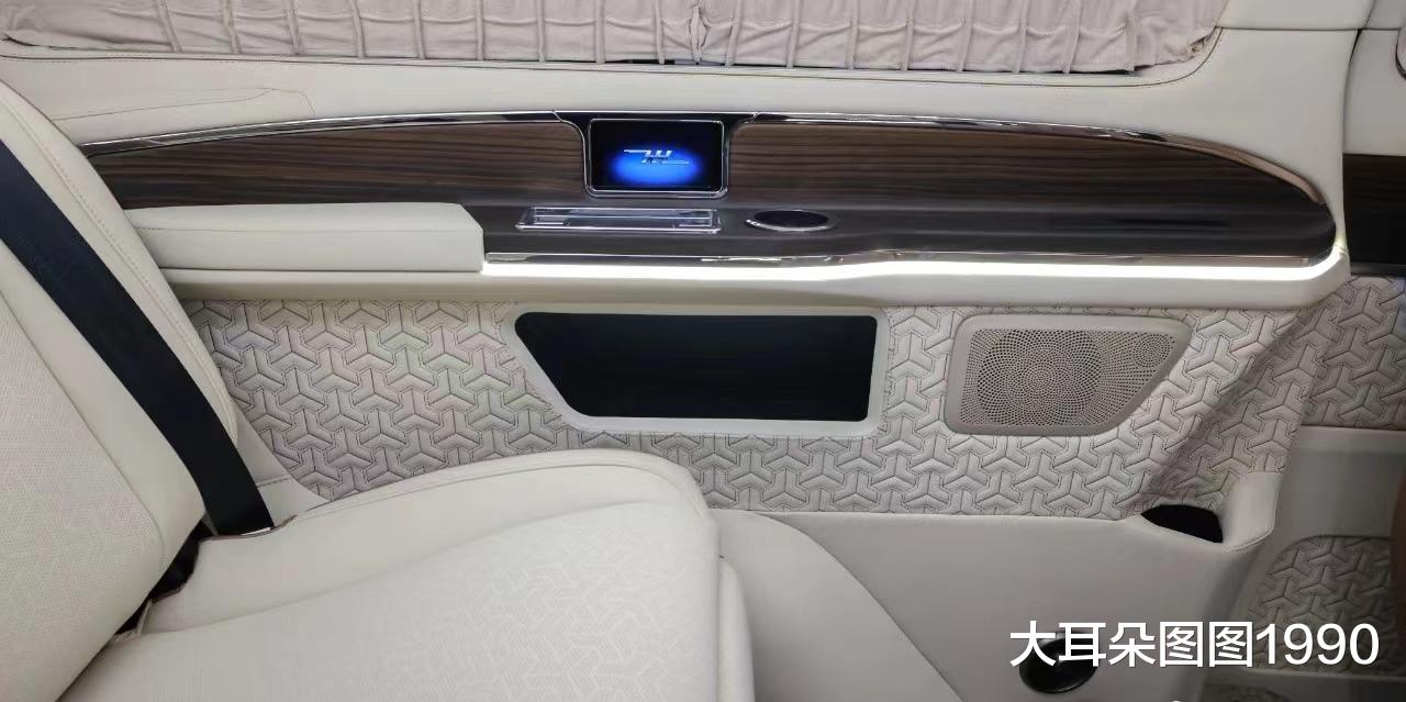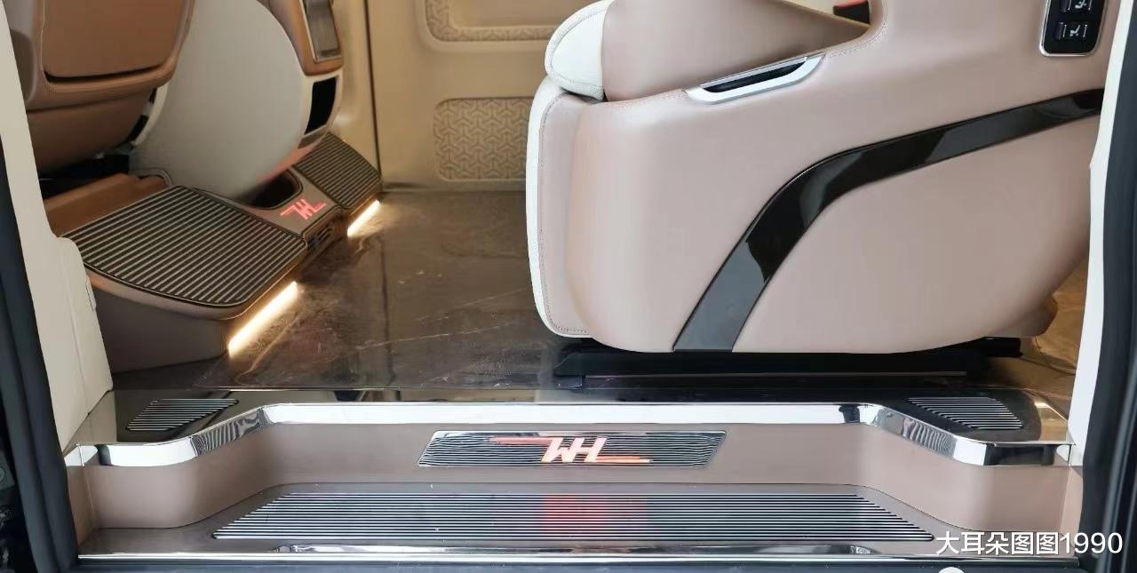 车内灯光的设计同样是采用了自然光线的设计,在保证车内的照明同时,更是满足了我们对于色彩的整体搭配 。最重要的是贵宾舱的整个控制系统采用了专属定制的集成控制系统,专属定制的集成线束完美的契合原车的线束。最大的败笔就是侧踏板采用了高光的不锈钢踏板,虽然拥有防滑功能,但高光确实比磨砂的镁铝合金更容易踩花;但不得不承认真的很漂亮!