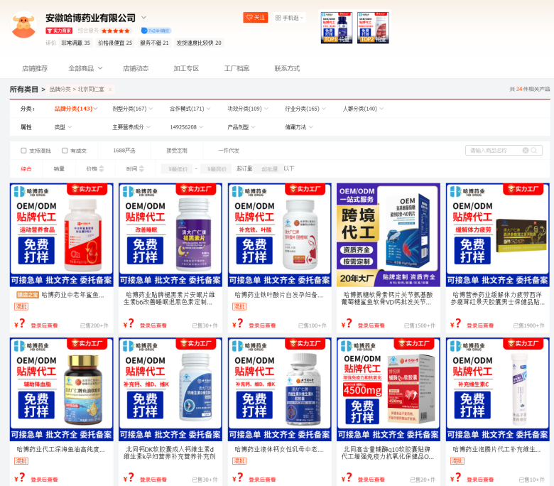 在1688网站上,哈博药业展示了百余种代工产品,其中为“同仁堂系”代工的产品有30余种,涵盖鱼油软胶囊、辅酶Q10等。