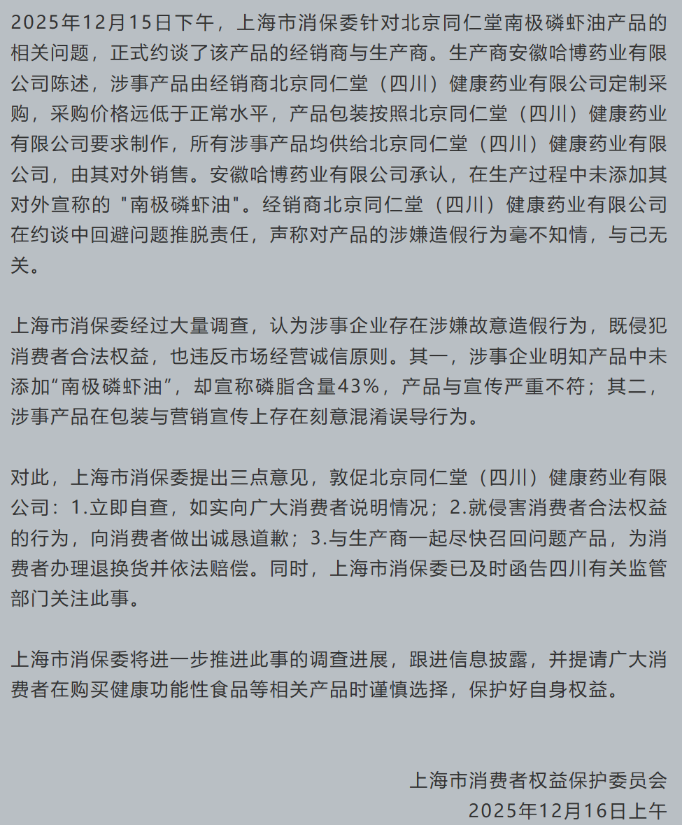 上海市消保委表示,涉事企业存在涉嫌故意造假行为,一是明知产品中未添加“南极磷虾油”,却宣称磷脂含量43%,产品与宣传严重不符;二是涉事产品在包装与营销宣传上存在刻意混淆误导行为。对此,上海市消保委敦促同仁堂四川健康药业立即自查,如实向广大消费者说明情况,就侵害消费者合法权益的行为,向消费者做出诚恳道歉,与生产商一起尽快召回问题产品,为消费者办理退换货并依法赔偿。