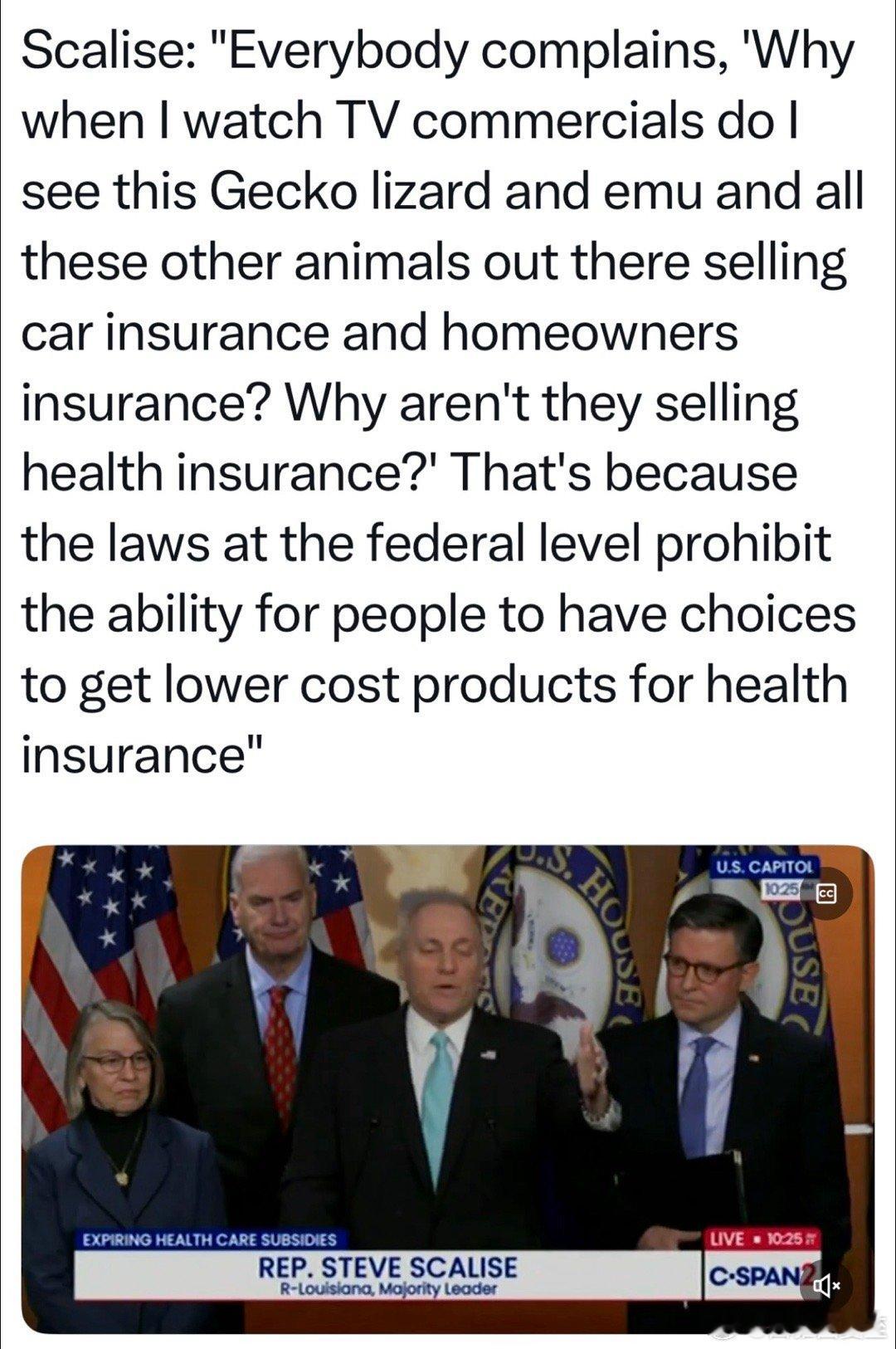 众议长:不会就“医保补贴”进行全体投票共和党中间派为避免“保费激增”做的最后努力失败众议院共和党新闻会:降医疗险的保费,应该允许他们做广告,像车辆险、房屋险那样(注:车辆险今年涨7-12%,房屋险今年涨8-10%)