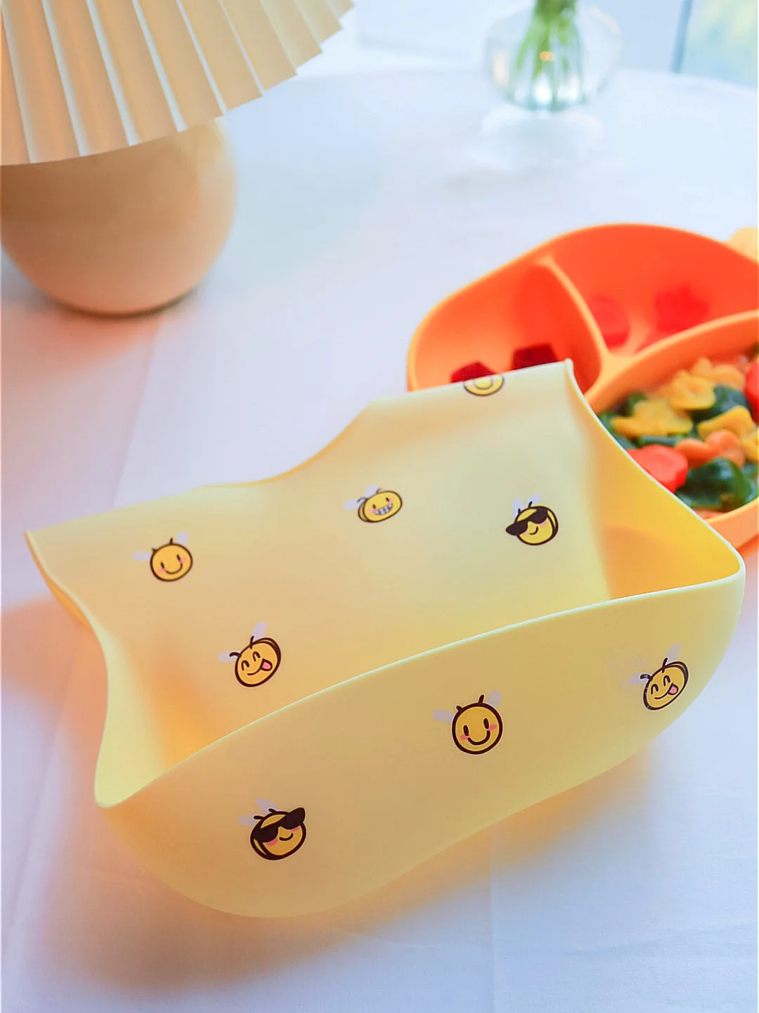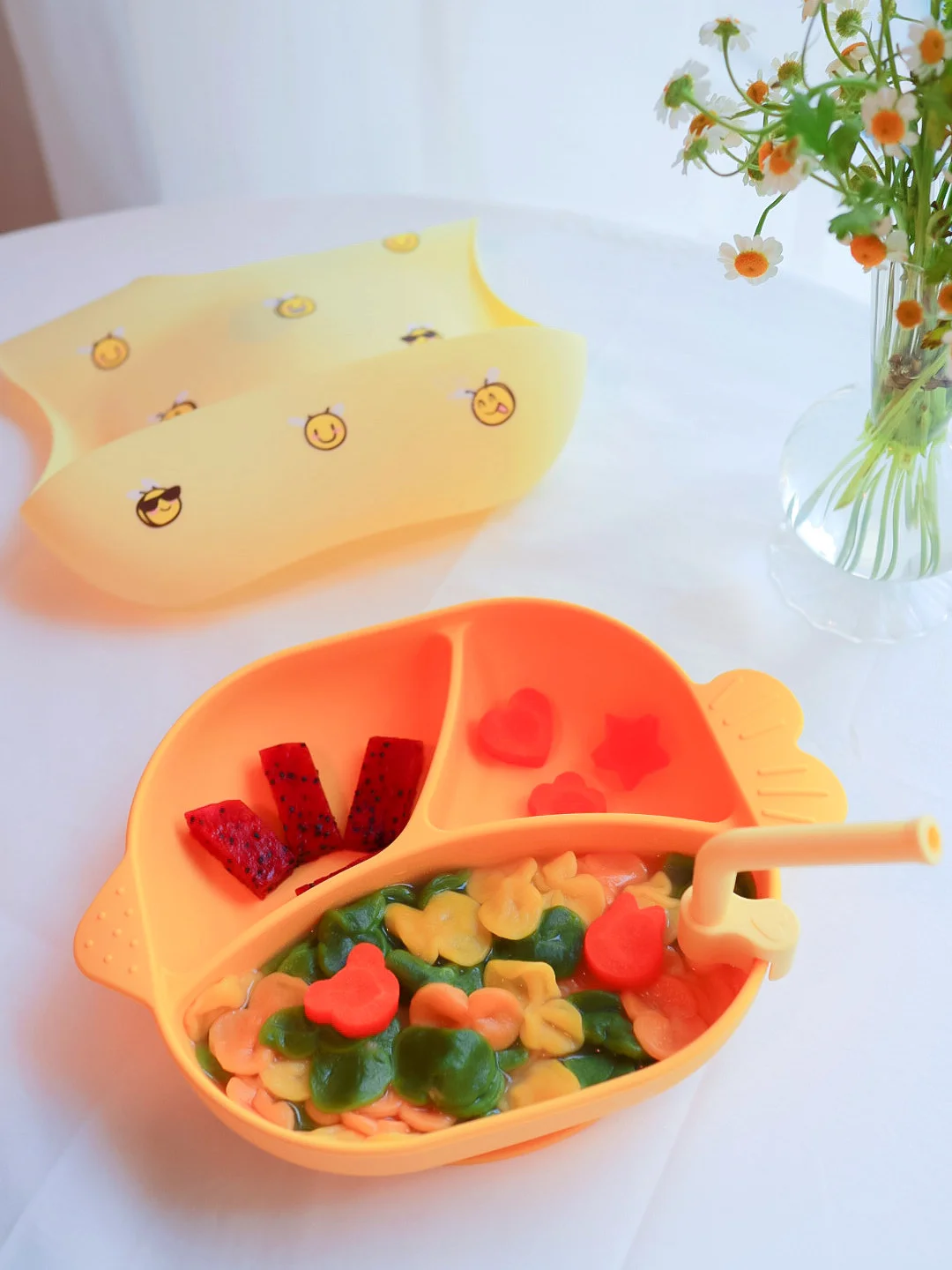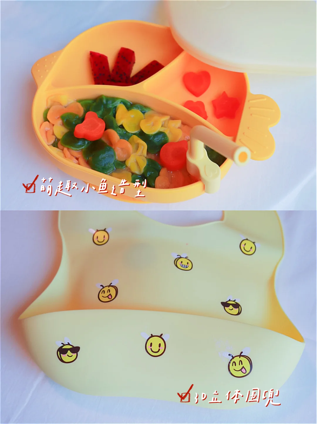beeshum家小鱼餐盘好可爱的一个,小鱼形状的盘子,里面有3个小格子,可以在每个小格子里搭配不同的食物给宝贝吃,放切好的水果,蝴蝶面和青菜,有木有看起来食欲满满,嘻嘻,肉嘟嘟的小手手在餐盘中拨弄食物,实在可爱极了,搭配宝宝用餐的硅胶围兜每个可爱的小mi蜂,真的是敲级nice呢[强],有时候宝宝指了指身上的小mi蜂,小家伙稚嫩的声音说嗡嗡嗡,真的甜蜜了妈妈的小心心[爱心]