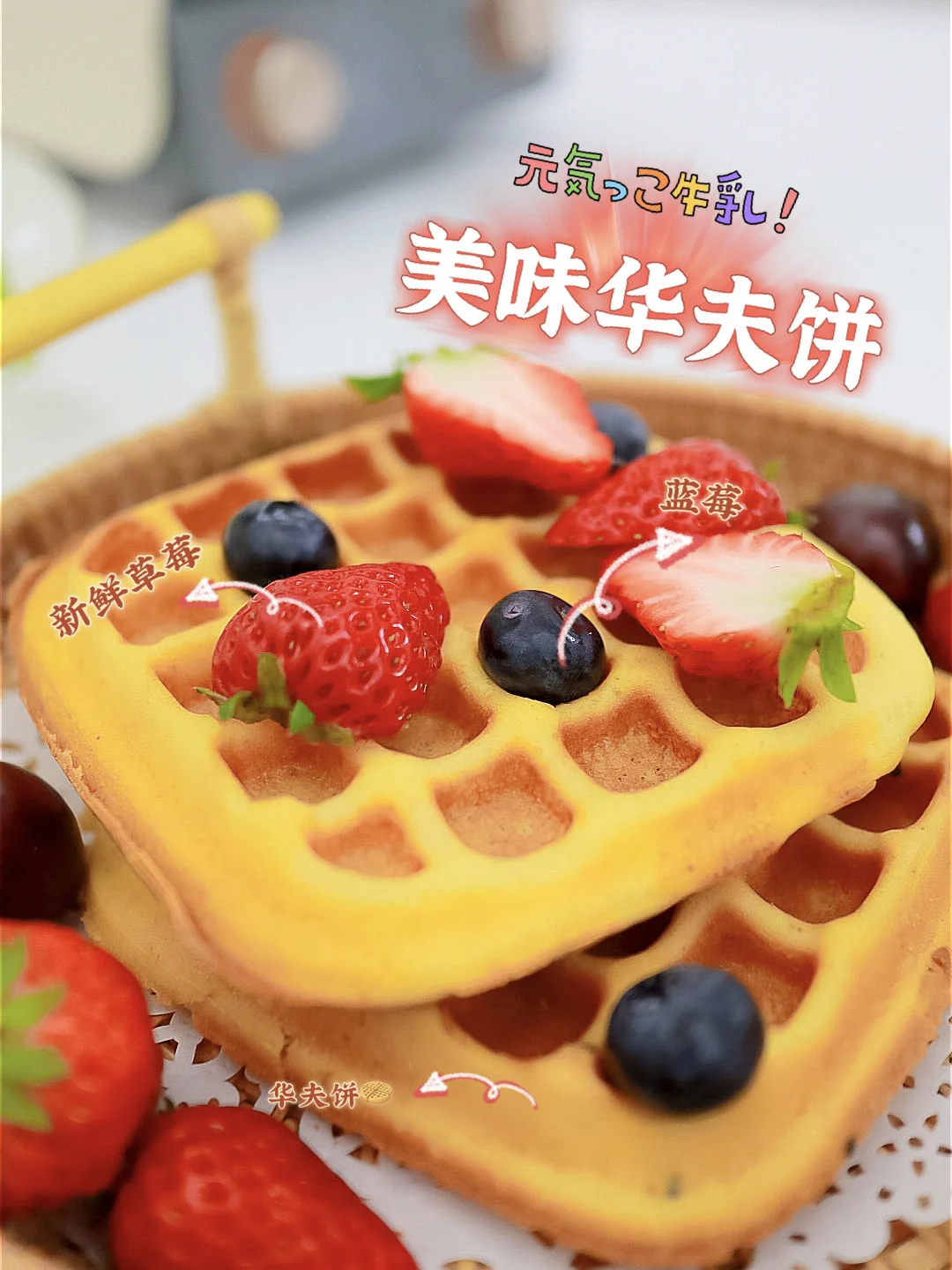 6️⃣做好的华夫饼上盘,加入你们喜欢的水果,或者冰淇淋,酸奶,奶油等等都可以。觉得不够甜还可以在面上撒上糖霜和蜂蜜