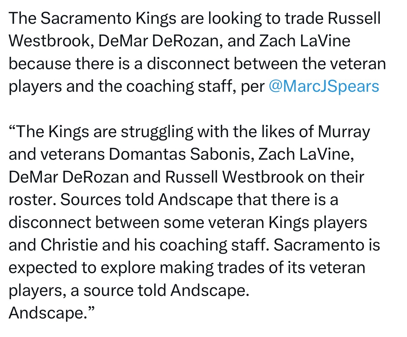 据记者Marc J. Spears报道,国王队正考虑交易威斯布鲁克、德罗赞和拉文,原因是老将球员与教练组之间存在隔阂。“国王队正面临穆雷以及老将萨博尼斯、拉文、德罗赞和威斯布鲁克等人构成的阵容难题。消息人士向Andscape透露,部分国王队老将球员与克里斯蒂(主教练)及其教练组之间存在隔阂。另有消息人士告诉Andscape,萨克拉门托预计将探索交易队内老将球员的可能性。”