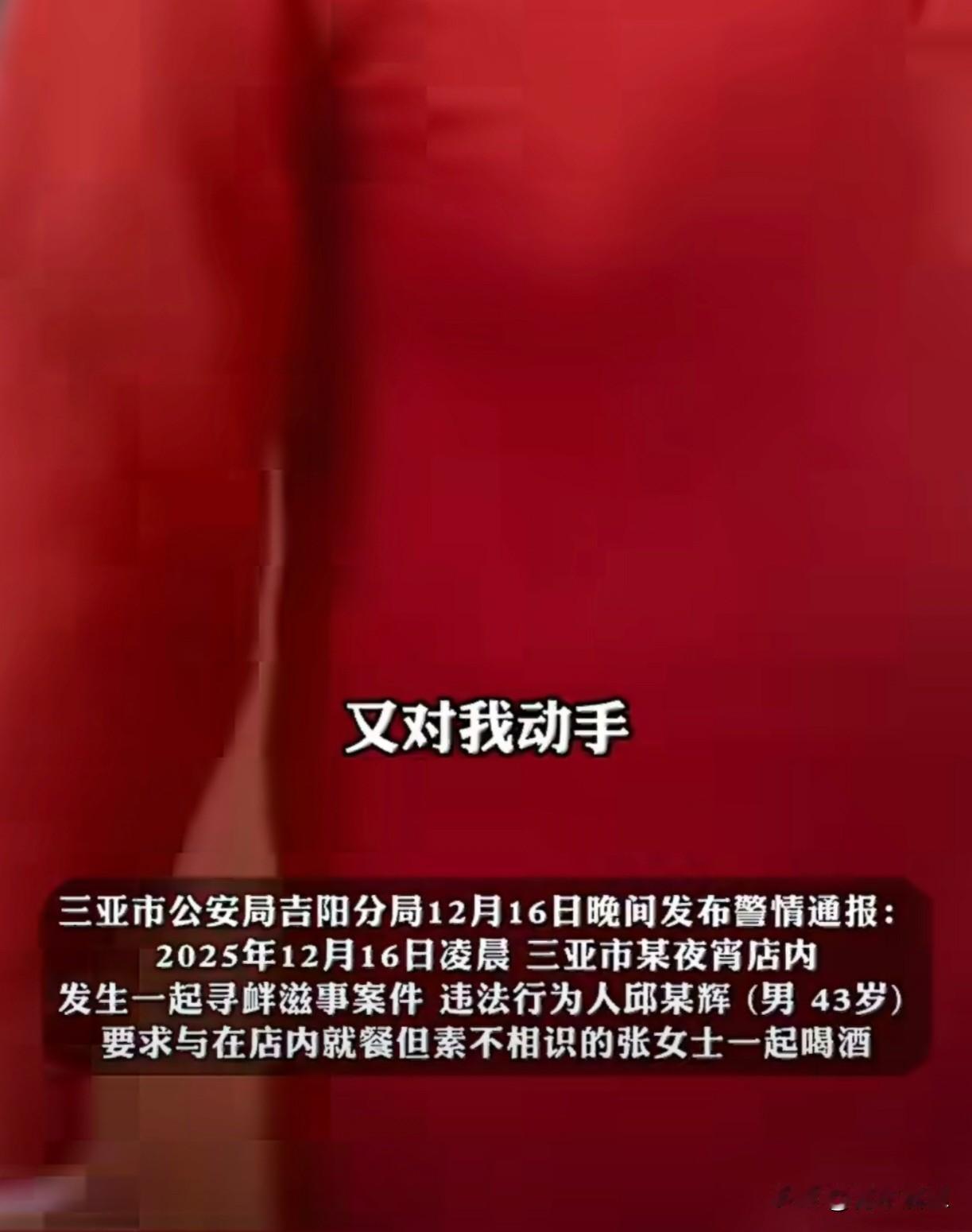 昨天凌晨,三亚市的某夜宵店内,43岁男子邱某想要和素不相识的女子张某一起喝酒,被拒绝后心里不痛快,竟然对其进行言语辱骂和推搡,导致张某身上多处轻微挫伤。最后警方依法对邱某处以了行政拘留15日的处罚。 这还没喝酒,就开始发酒疯了?要是真的和他喝上几杯,岂不是要上天。 人家姑娘拒绝一起喝酒,这是她的自由和权利。一个大男人,连最基本的尊重和自控都没有,15天拘留算轻的,不长记性话,下次指不定干出更离谱的事。