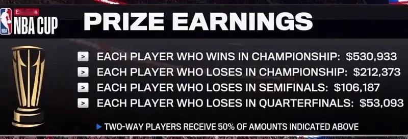 尼克斯获得NBA杯冠军,每名球员获得税前530933美元的奖金。马刺每名球员获得212373美元的奖金。其余四强球队每名球员获得106187美元的奖金。湖人、热火、猛龙、太阳的各名球员获得53093美元的奖金。每队双向球员都可以获得50%对应的奖金。