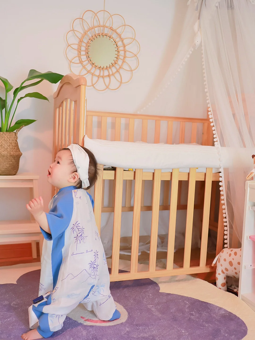 天热了,之前的长袖睡袋好多穿不了了,所以入了短袖睡袋。虽然我们是女孩纸,但是一眼就看中了这个蓝色,竹棉纱布的,面料很柔软。领子那里是圆弧形的,不会磨到宝贝的皮肤,下腿部分也是做了加宽的设计,宝宝腿腿不会受到束缚