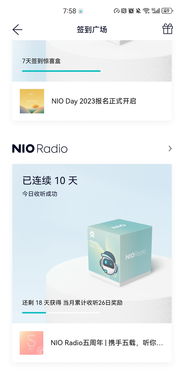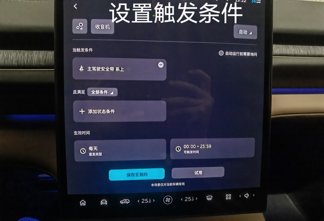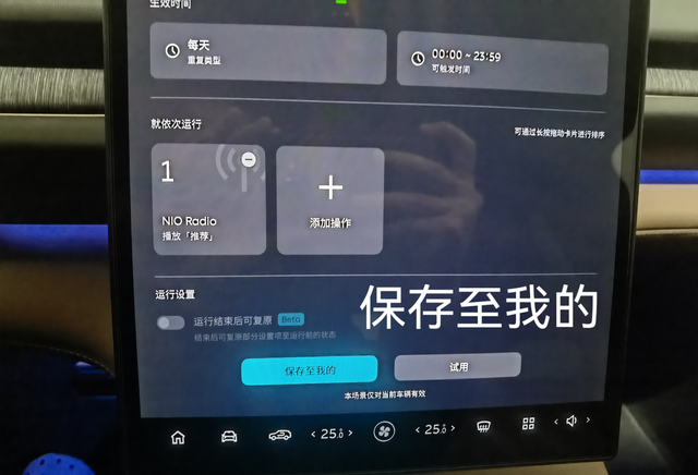 收音机打卡必备场景 蔚来app有签到打卡和NIO Radio打卡 由于签到可以直接app打卡操作方便,但Radio需要每天收听满10分钟后自动签到,但每次上车需手动切换到收音机,比较麻烦。 现在教大家一个上车自动开启Radio的快捷场景,主界面下方点击四个方框,进入界面点击快捷场景,创建快捷场景界面后,左上角重命名,右上角改为自动,当前触发条件主驾系上安全带,依次运行选Radio推荐,保存至我的。 以后上车系好安全带出发后自动播放Radio,不会再忘记签到了