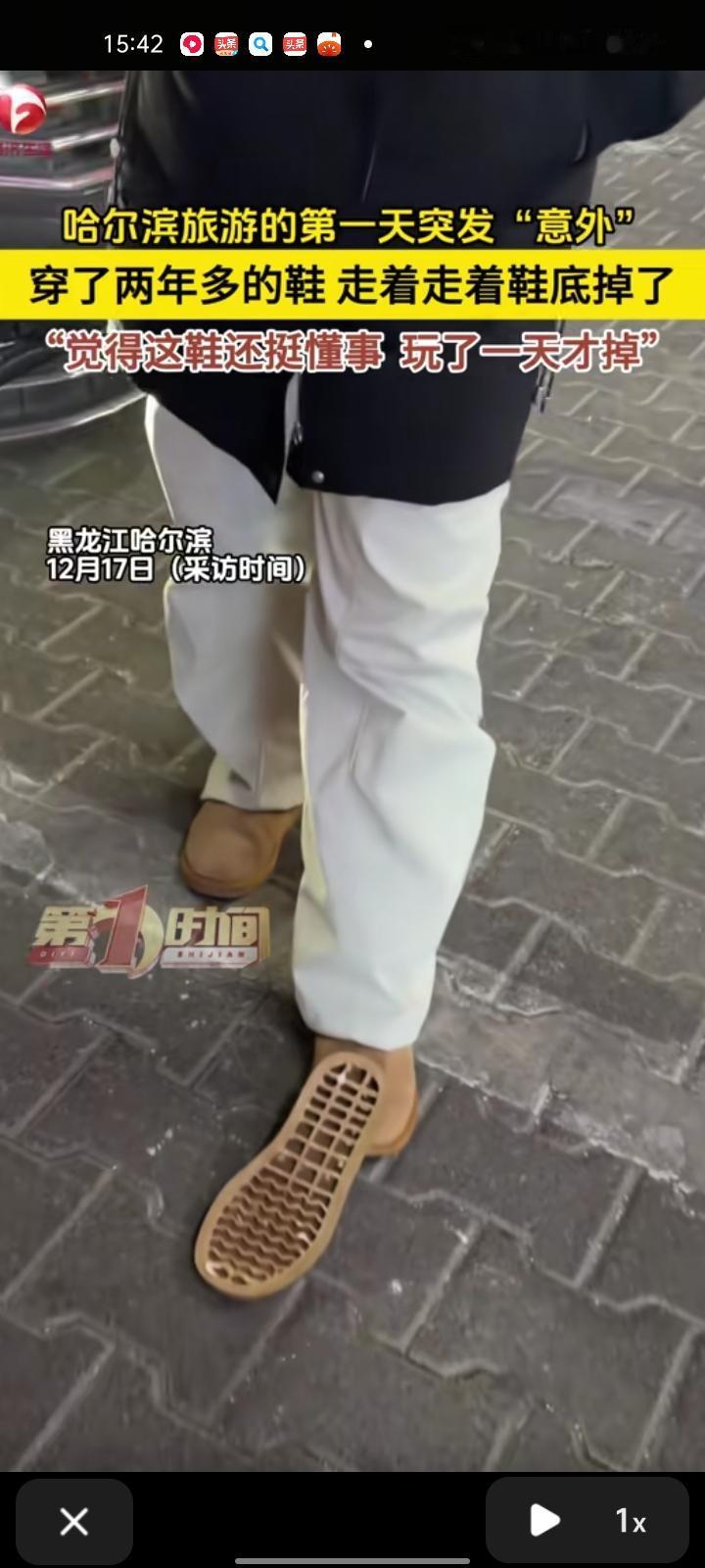 12月16日,黑龙江哈尔滨。女子发视频表示,来哈尔滨旅游第一天突发“意外”,在老家穿了两年的鞋走着走着,鞋底就掉了。回头翻看照片发现是在冰雪大世界,鞋底有一点点开胶了,觉得这双鞋挺懂事的。