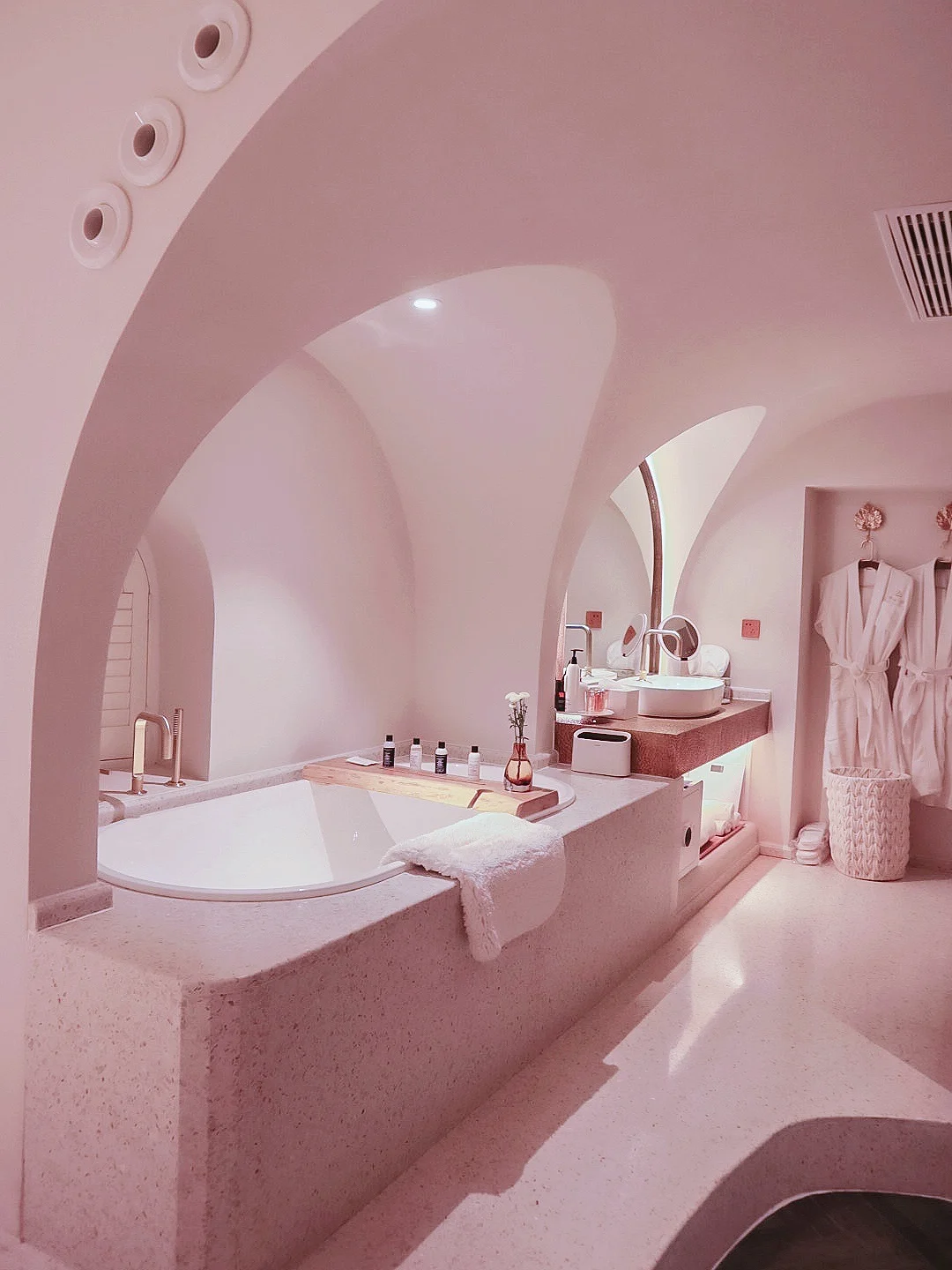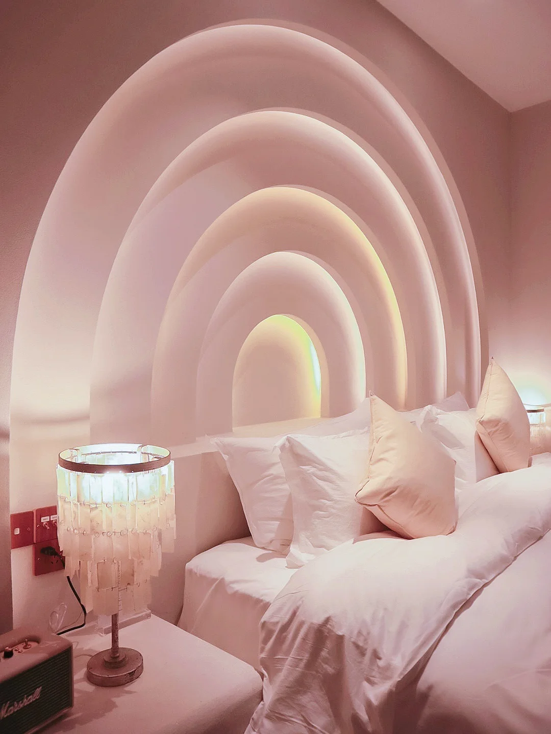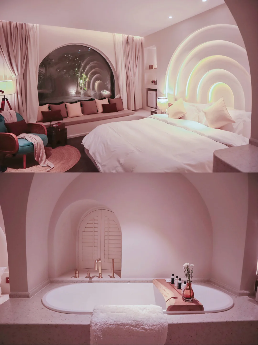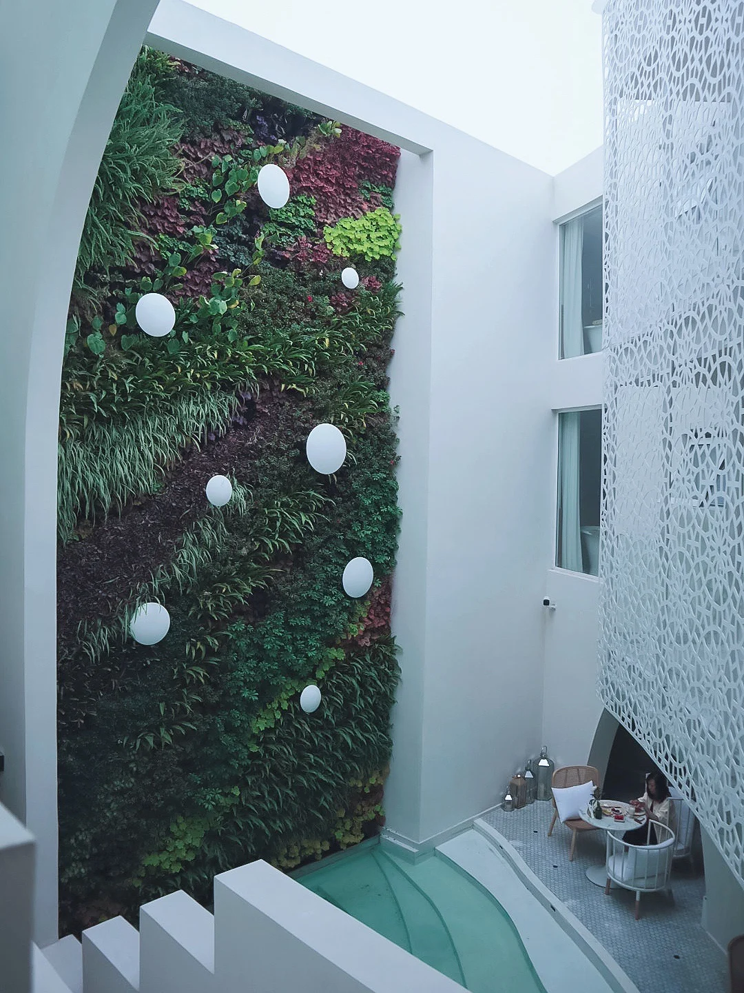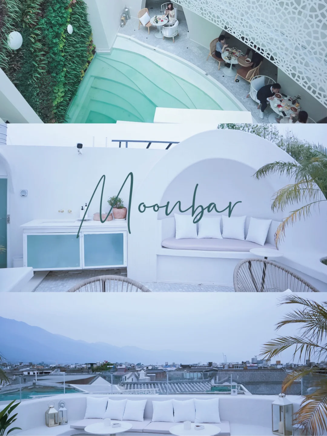 走出房间,更是让你欣喜不以。弧形的拱门设计,白色的纪念碑谷同款楼梯、墙上的镂空花纹,通高的整片绿植墙。通过光和影的润色,一切都是那么唯美。顺着楼梯能一直到达屋顶的露台,直接全景看苍山日落🌇,远处三塔也若隐若现。端上一杯浓浓的咖啡,慢慢去感受时刻变幻着的大理古城之美!