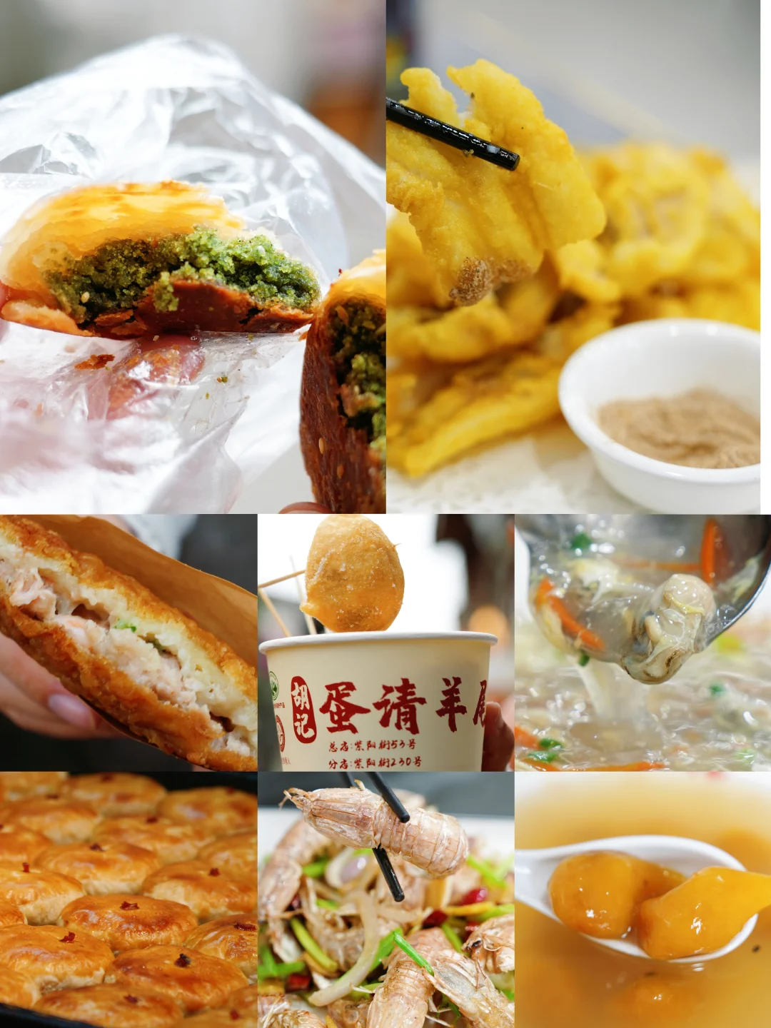 重点狂炫美食!海苔饼酥皮香脆、海苔味浓郁,芡糕裹着肉汁超满足,泡虾外酥里嫩藏着整只虾,还有蛋清羊尾、姜汁调蛋,每口都是地道风味。