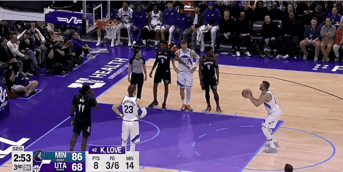 NBA常规赛,森林狼对阵爵士的比赛正在进行中。第三节比赛,乐福被犯规后两罚稳稳命中,目前个人已砍下10分。