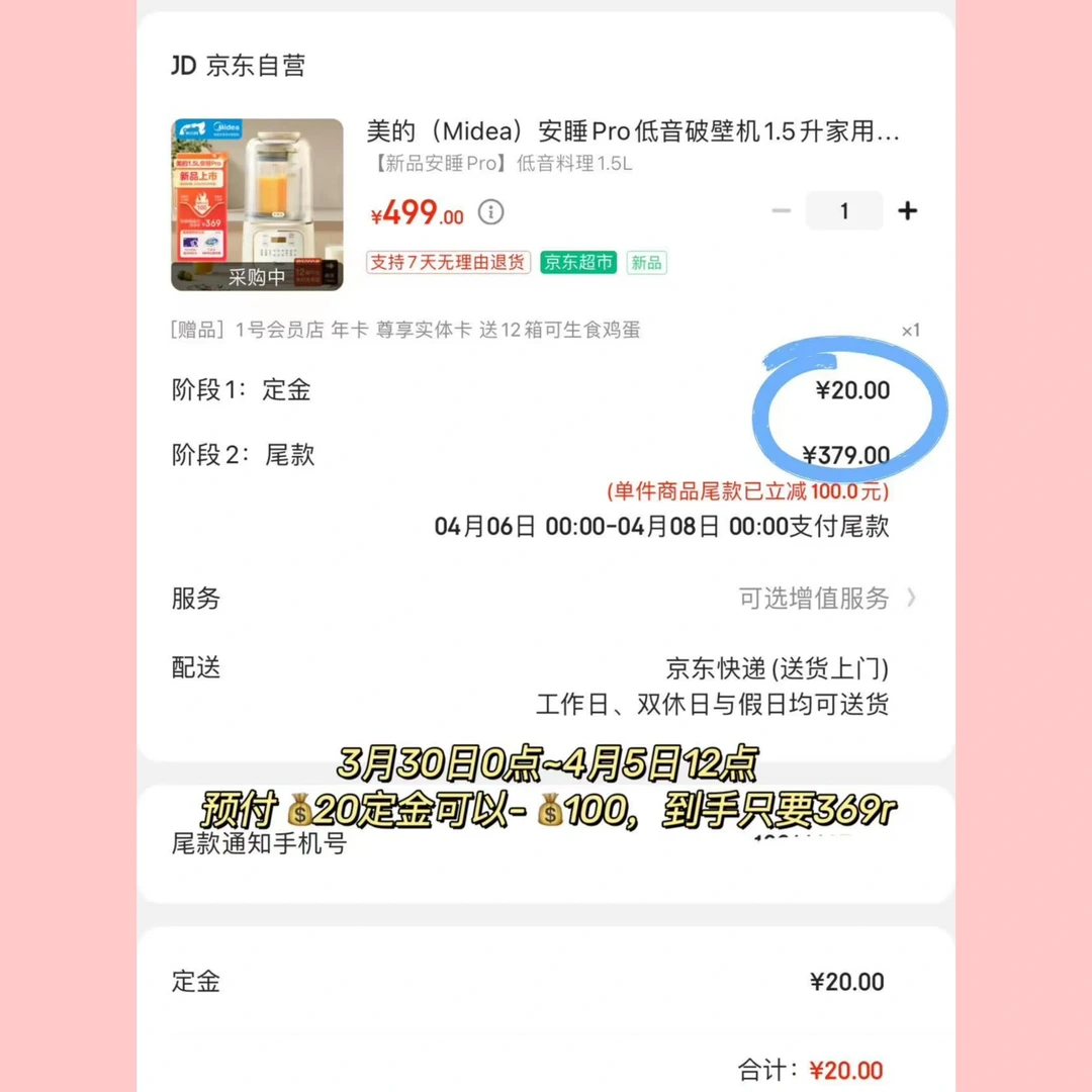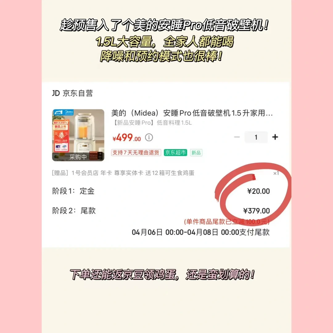 时间3月30日0点~4月5日12点,预付💰20定金可以-💰100,到手只要369r,下单还能返京豆领鸡蛋,还是蛮划算的!想换破壁机的姐妹可以考虑一下~!